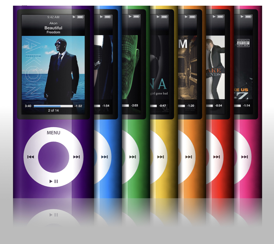아이팟 나노는 청바지의 앞 주머니 속 작은 주머니를 가리키며, "이 주머니는 도대체 무슨 주머니일까요?"라는 스티브 잡스의 질문과 함께 작아지고 얇아진 디자인 어필하였다. 또한 화면을 볼 필요가 없는 활동적인 사람들을 위해 화면을 없애기까지 한 아이팟 셔플이 있었다.