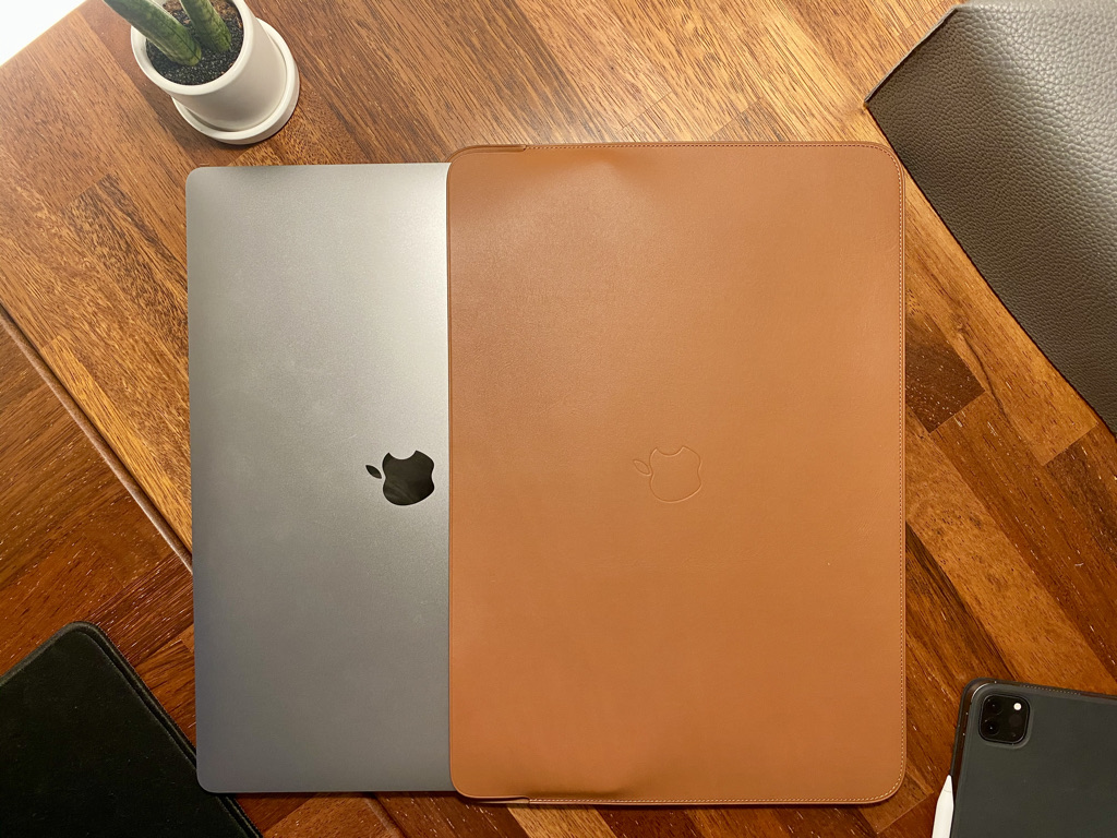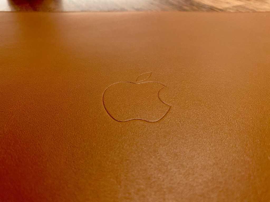 가죽은 매우 부드럽다. 바느질 또한 꼼꼼하게 되어있고 마감이 전체적으로 매우 훌룡하다. 슬리브 중앙에는 애플 로고가 자리 잡고 있다.