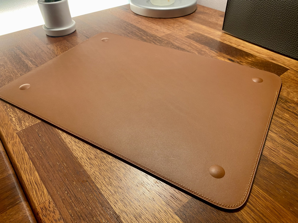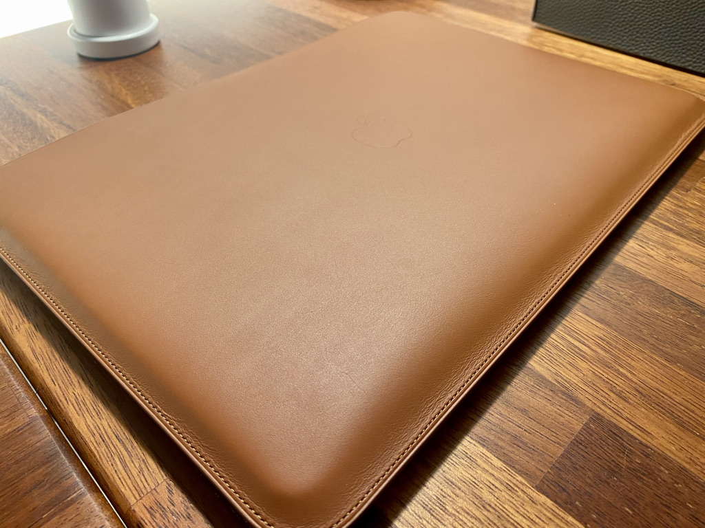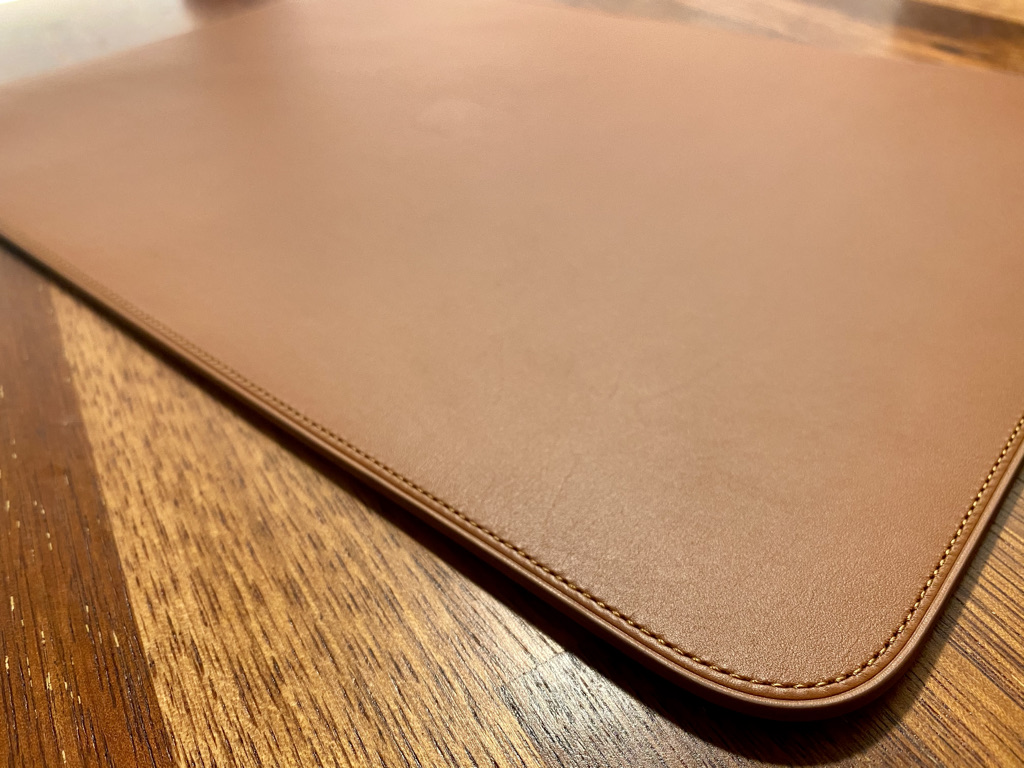 가죽은 매우 부드럽다. 바느질 또한 꼼꼼하게 되어있고 마감이 전체적으로 매우 훌룡하다. 슬리브 중앙에는 애플 로고가 자리 잡고 있다.