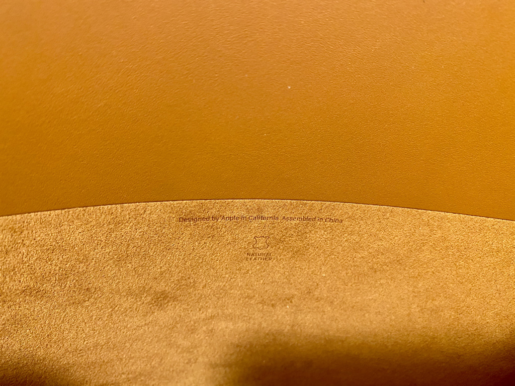 슬리브 뒷면에는 맥북 고무 발판과 꼭 맞는 홈이 있다. 안쪽에는 'Designed by Apple in California, Assembled in China'라는 문구가 새겨져 있다. 애플 공식 홈페이지에는 고급 유럽 가죽을 사용했다고 되어있는걸 보아 가죽만 중국으로 보내 중국에서 생산하는 듯하다. 안쪽은 극세사로 되어있어 매우 부드럽다.