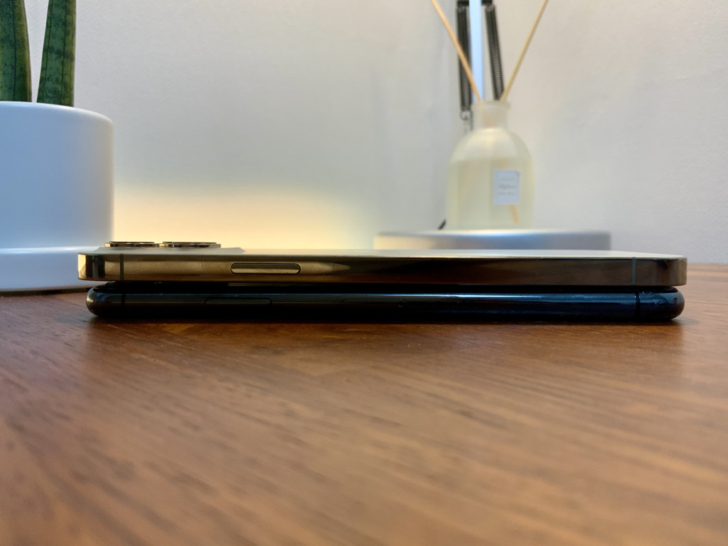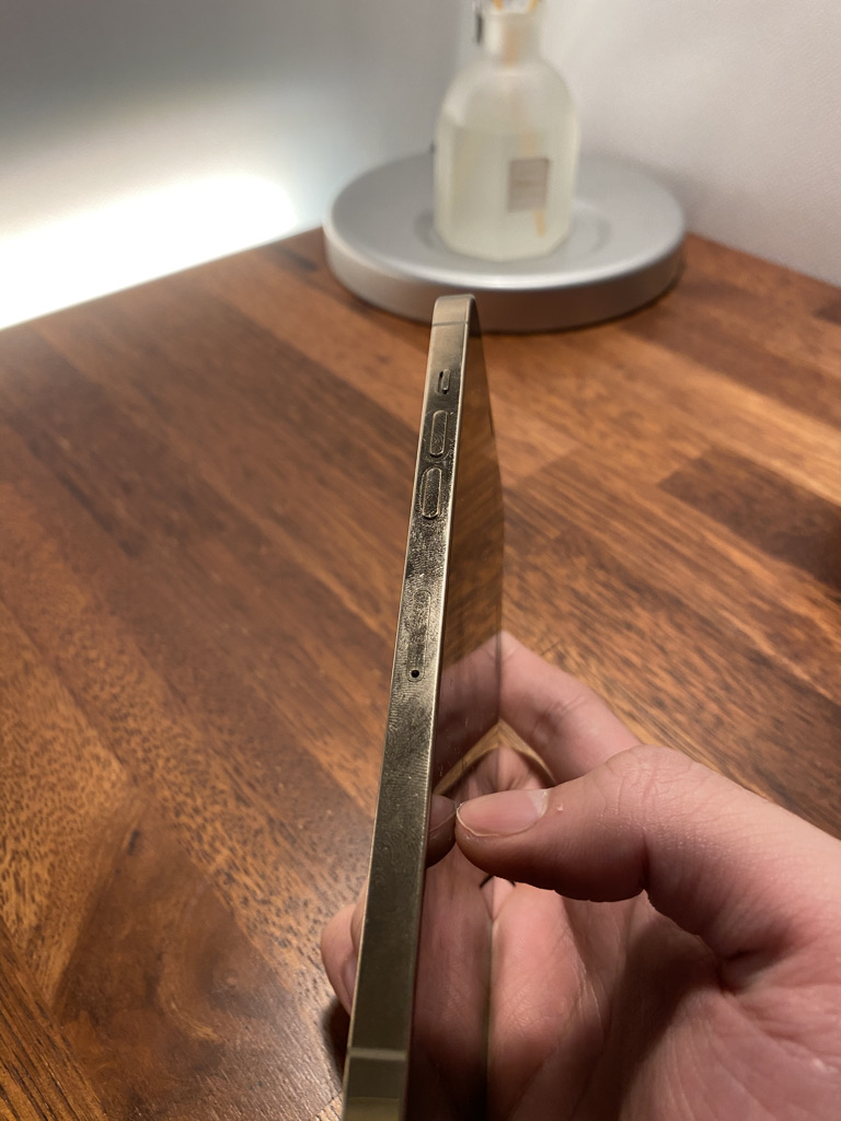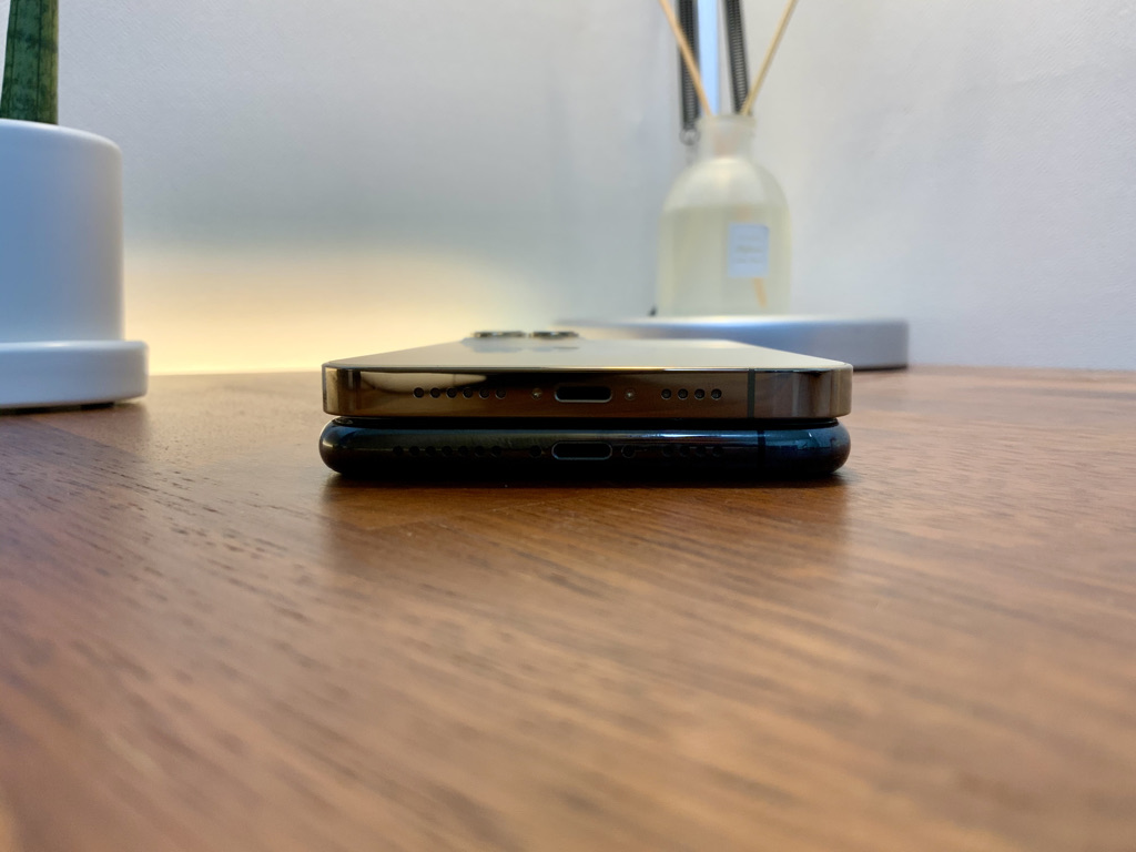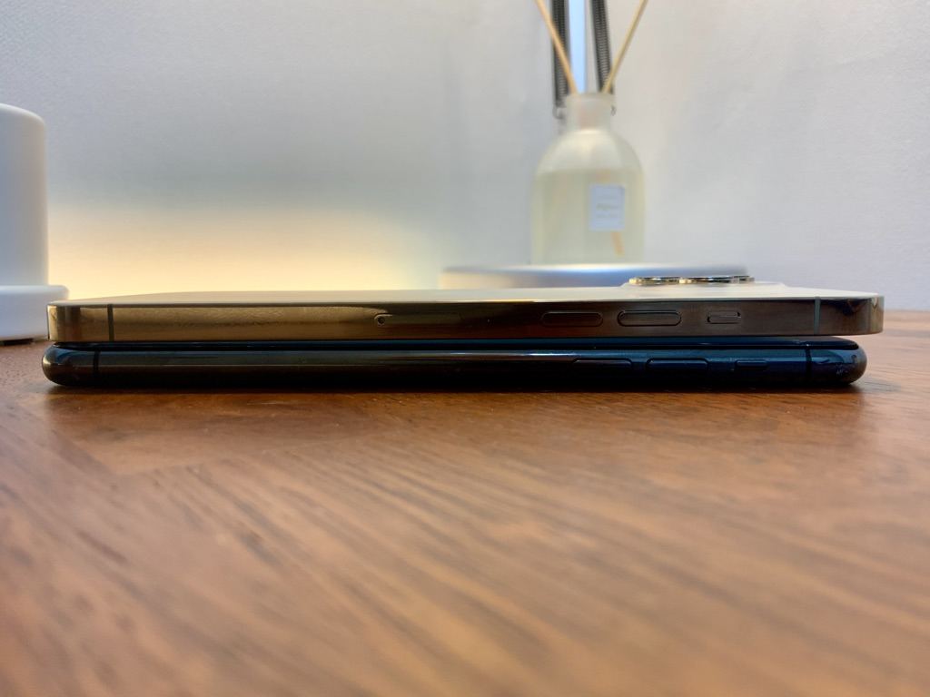 무음 버튼과 볼륨버트는 11 프로 맥스와 비교했을 때 더 아래쪽에 위치한다. 처음에는 위치가 너무 낮게 느껴졌지만 사실 잡았을 때 엄지손가락과 더 가까워졌다. 볼륨 버튼과 마찬가지로 파워 버튼도 더 아래쪽에 위치한다. 모서리가 평평해서 그런지는 몰라도 버튼이 더 클리키하게 느껴진다. 안테나 라인의 위치는 모두 큰 차이가 없었다.
