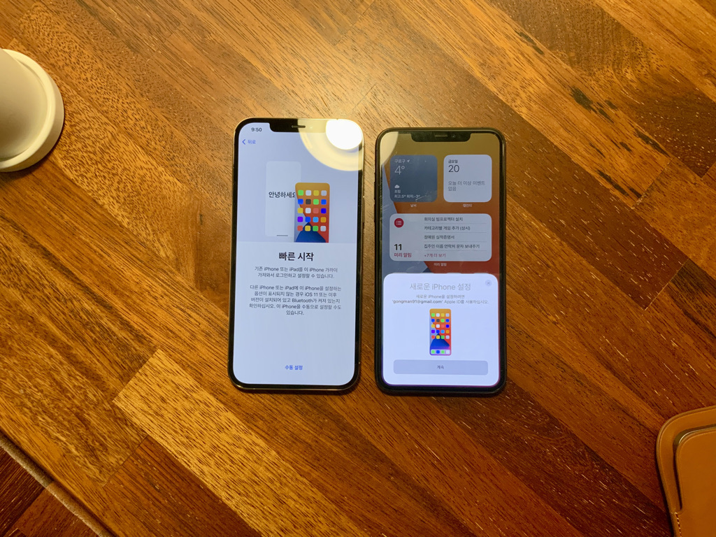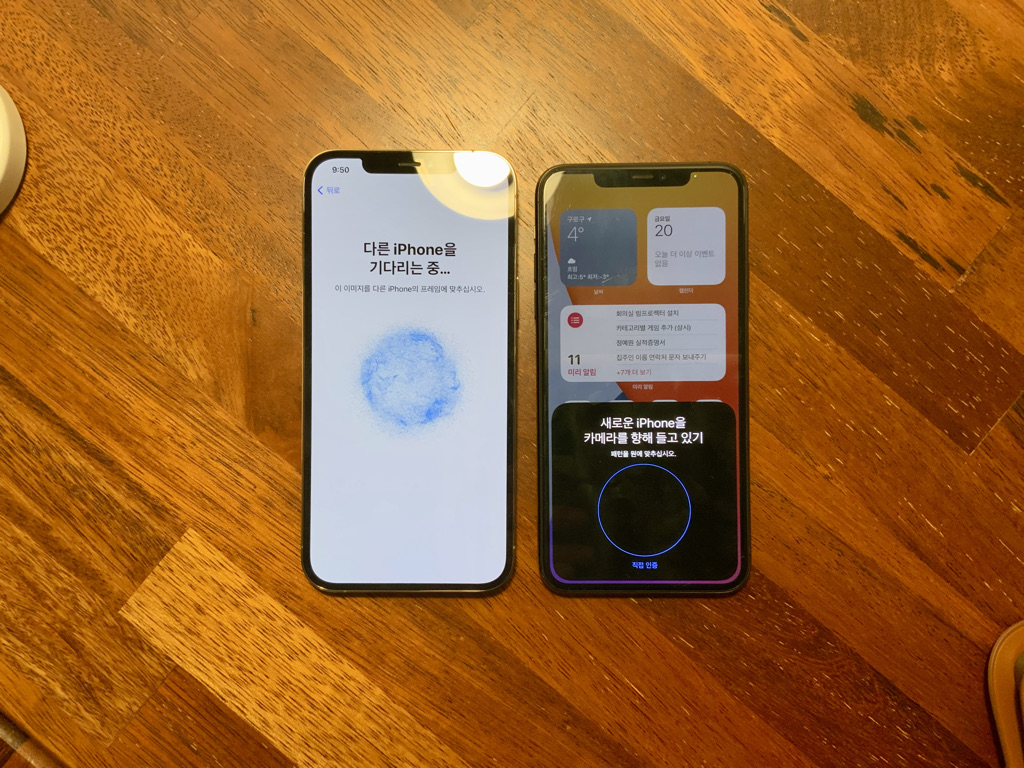이전 폰으로부터의 세팅은 매우 쉽다. 아이클라우드를 사용하여 불러오거나 사진과 같이 새 폰을 기존 폰에 가까이 가져가 인식시키고 기존 폰의 카메라로 새 폰 중앙의 파란 문양을 비추면 자동으로 세팅은 완료된다.