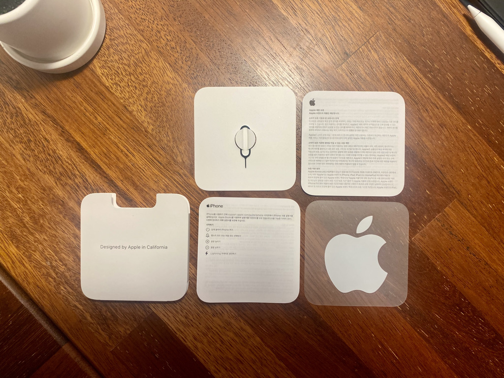 길이가 반으로 줄어 정사각형이 된 설명서 패키지 내에는 간단 사용 설명서, 한 장의 애플스티커, 유심 핀이 동봉되어 있다.