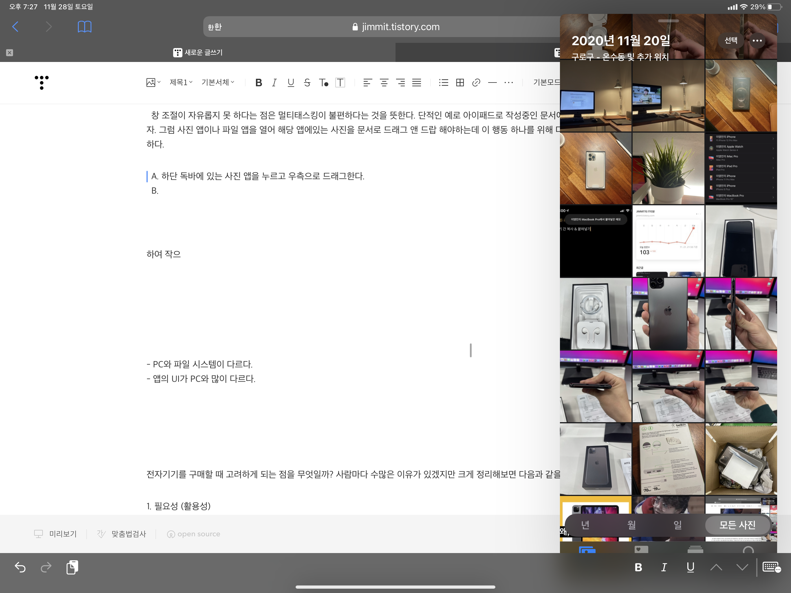 아이패드의 기본 창 모드는 전체 화면이다. 전체 화면이다 보니 위와 같은 불편함이 지속적으로 느껴질 수밖에 없다. 더군다나 드래그 도중 앱을 놓친다면 자석처럼 화면에 원하지 않는 모드로 붙어버린다. 이런 애로사항이 사용하는 내내 일어나기 때문에 익숙해지기 전까진 매우 큰 스트레스로 다가온다.