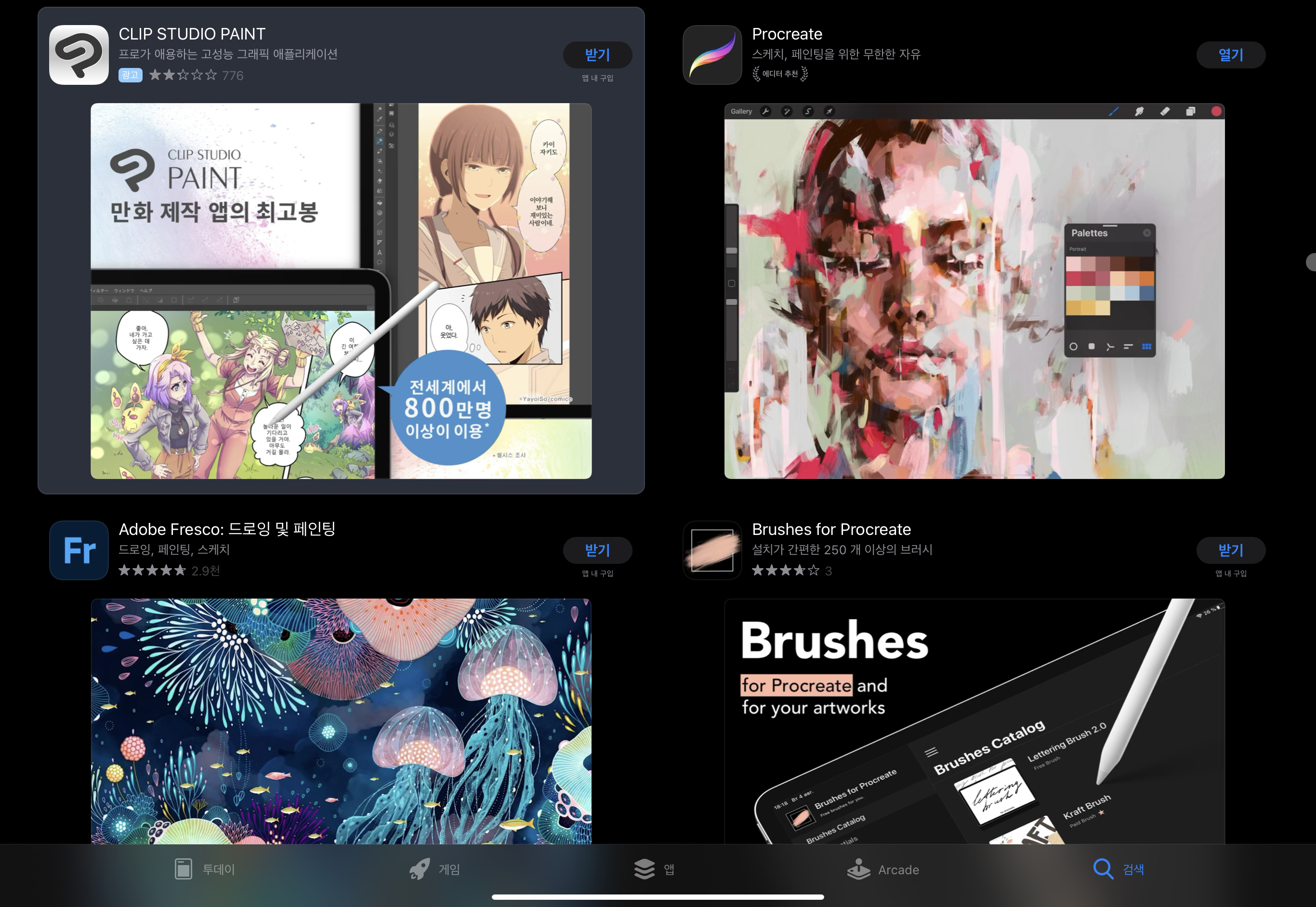 드디어 컴퓨터가 절대 대체할 수 없는 영역이다. 당신이 그림을 그리고자 한다면 지체 없이 아이패드와 호환되는 애플 펜슬을 구매하길 바란다. 특히 아이패드 프로 모델은 9ms (1000분의 9초)의 반응속도를 자랑한다. 매우 빠른 반응속도가 필요한 롤 프로게임 대회에서 20ms 이하의 환경을 정상으로 간주하는 것을 봤을 때 9ms는 일반인의 입장에서 딜레이가 아예 없다고 봐도 무방하다. 관련 앱도 많이 준비되어 있고 펜 쓸 때의 질감을 바꿔주는 보호필름도 많이 준비되어 있으니 애플 펜슬과 함께 신나게 그리길 바란다.