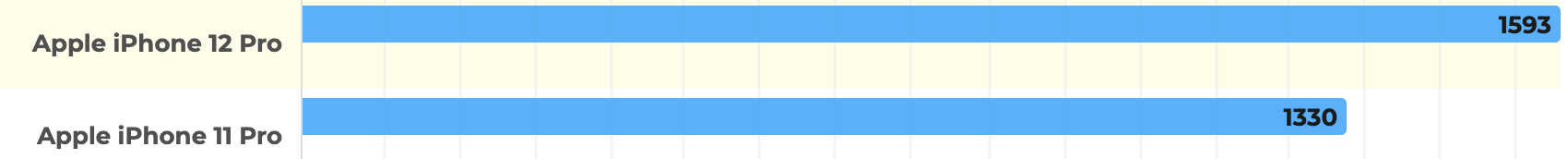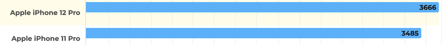 12는 5나노 공정의 A14칩을, 11은 7 나노 공정의 A13칩을 탑재하였다. 싱글코어 기준으로 약 20%의 성능 향상을, 멀티코어 기준으로 약 5.2%의 성능 향상을 이뤄냈다. 멀티코어 기준으로 보면 큰 성능 향상이 없는 것처럼 보이나, A13는 이미 스마트폰 CPU 중 최고 성능이었다는 점을 기억하자.