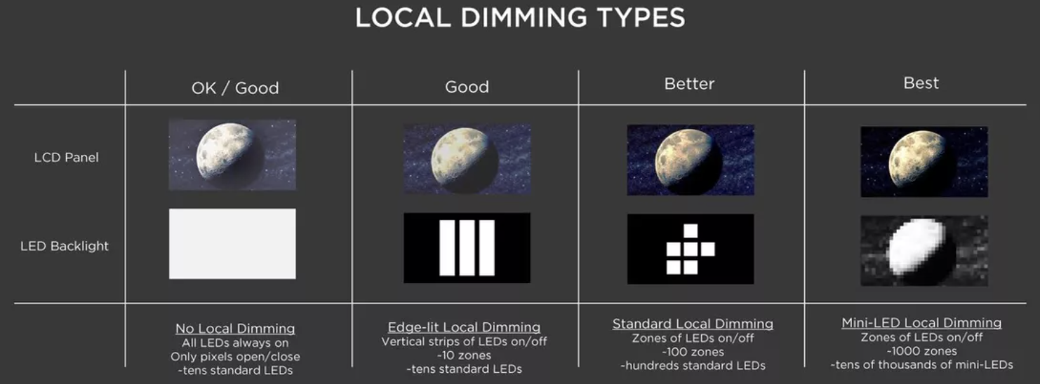 LED 디스플레이는 밝기 조절을 위해 LED를 백라이트로 사용하는데, LED 소자가 작아질수록 상세한 밝기 표현이 가능해진다. 애플의 Pro Display XDR의 경우 총 576개의 로컬 디밍 존을 가지는데, 이는 사진 속 Better 등급에 해당된다. 미니 LED는 더 많은 로컬 디밍 존으로 빛이 필요 없는 부분은 LED를 완전히 꺼두어 더 정확한 색표현이 가능하다. 미니 LED는 OLED 보다 번인에 강하고 전력 소모량이 낮다.