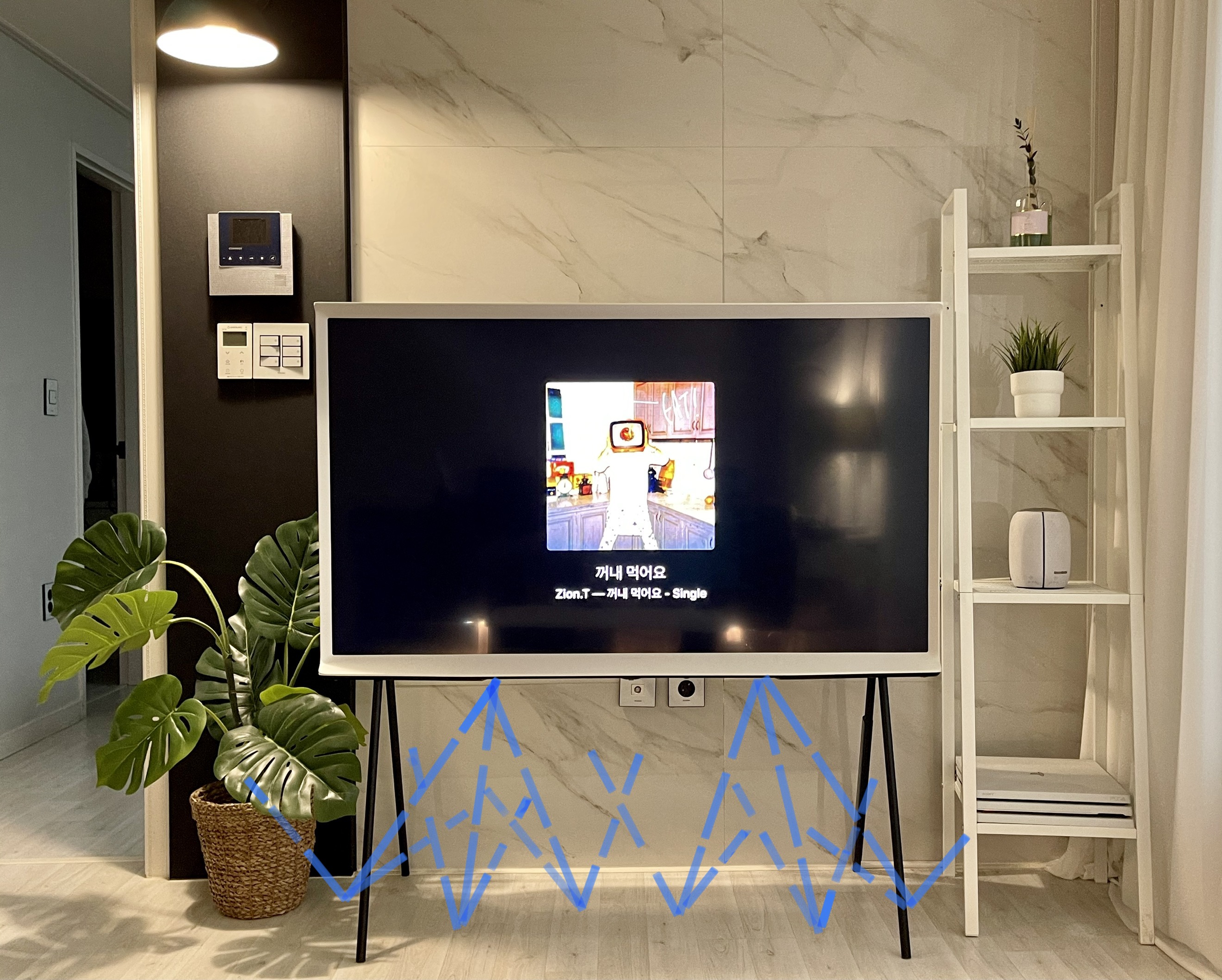 세리프 TV의 가장 큰 장점은 의외로 디자인이 아닌 사운드이다. 세리프 TV를 구매하기 전엔 49인치 중소기업 TV를 사용 중이었는데, 세리프 TV를 처음 켰을 때 풍부한 음량과 공간감에 매우 놀란 기억이 있다. 세리프 TV의 사운드 스펙은 40W, 4채널이다. 보편적인 삼성 QLED TV의 사운드 스펙이 20W, 2 채널임을 감안하면 세리프 TV가 얼마나 뛰어난 사운드 퀄리티를 갖고 있는지 알 수 있다. 또 세리프 TV의 스피커는 티비 바닥에 달려있다. 소리를 바닥에 쏴서 한번 반사시키기 때문에 소리가 더욱 풍부하게 느껴진다.