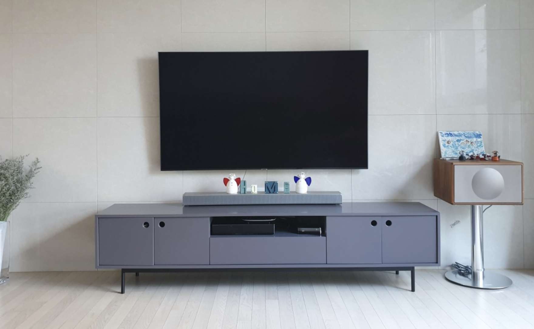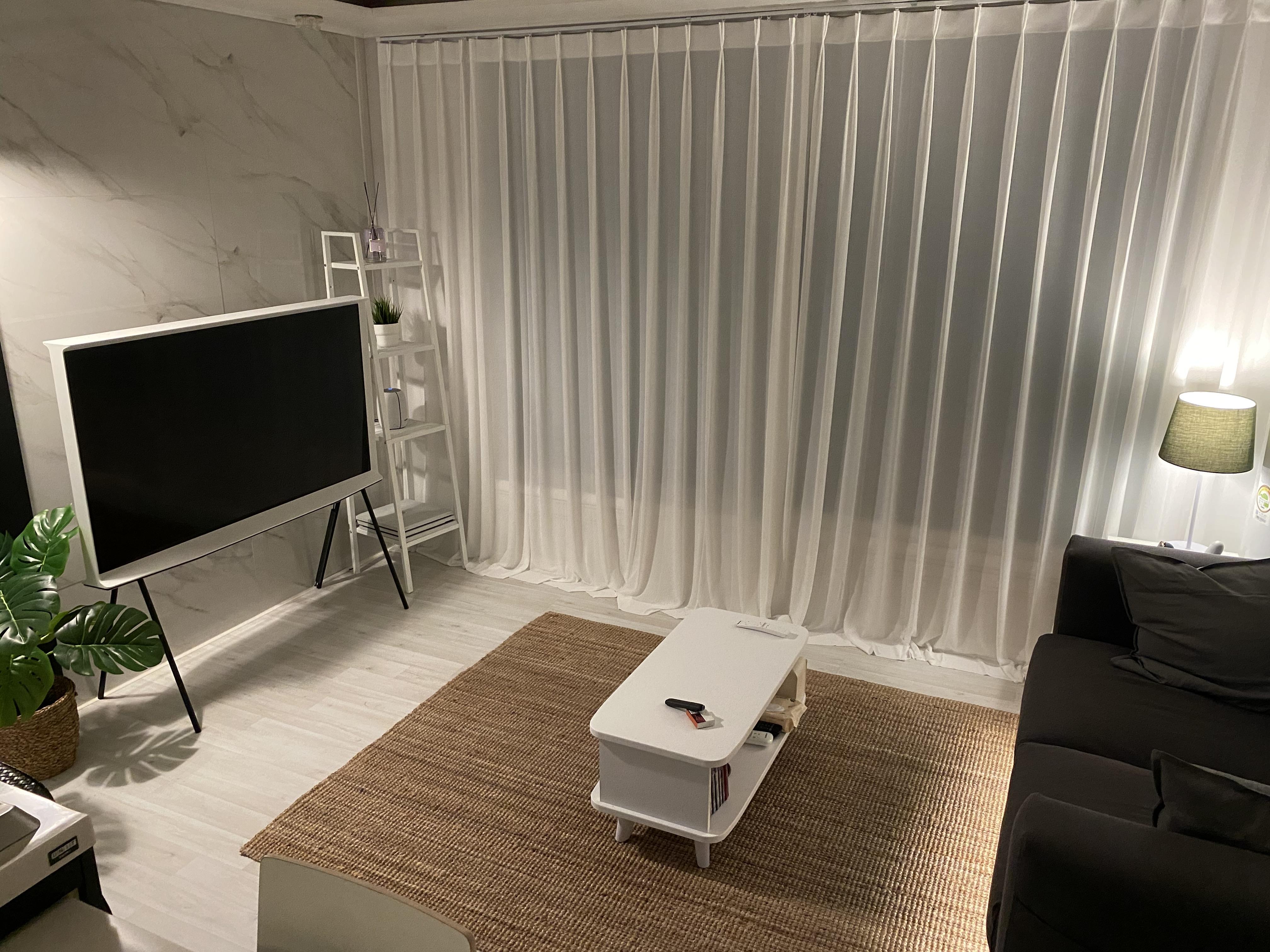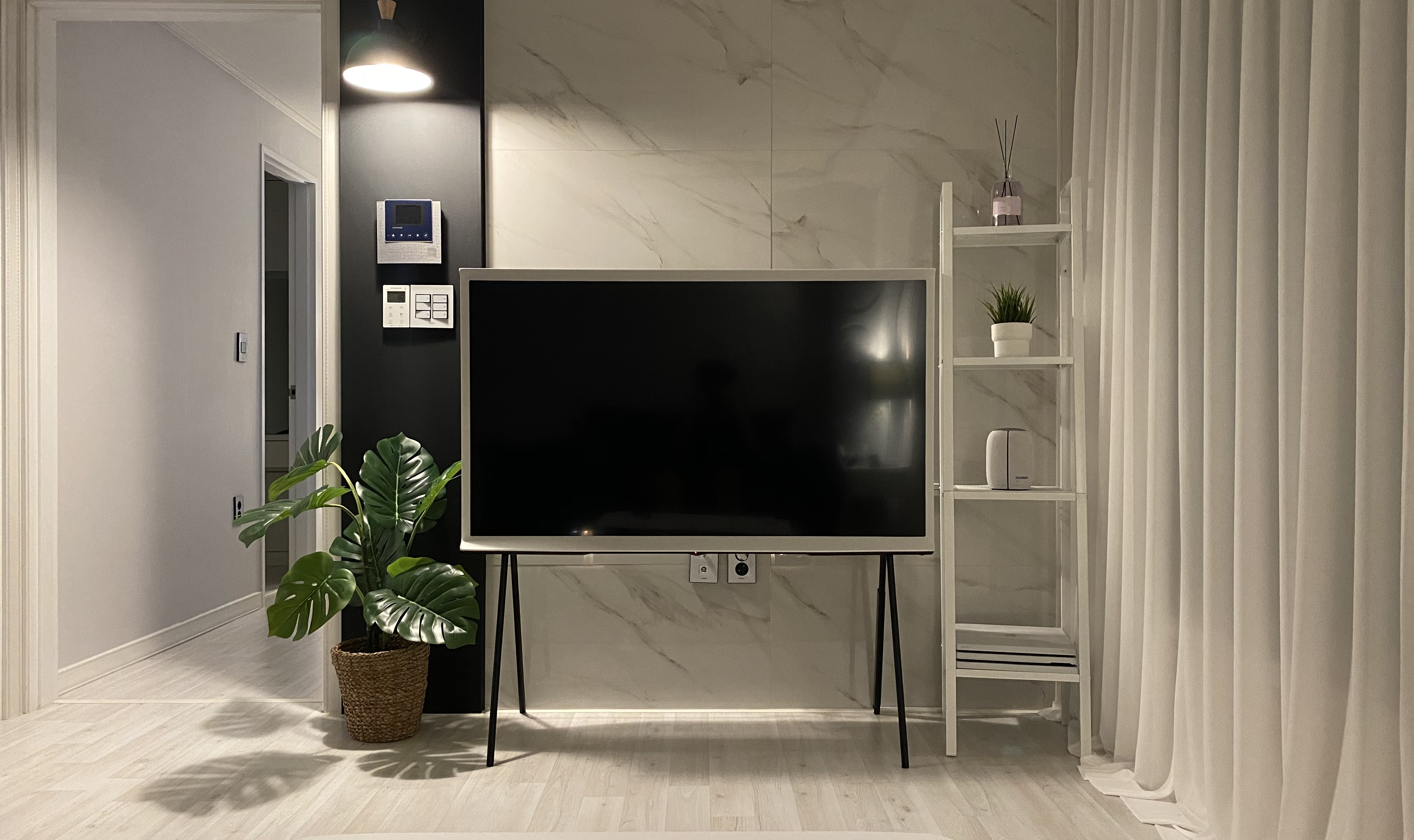 쇼파와 TV는 거실 인테리어에서 가장 큰 비중을 차지한다. 거실 앞, 뒤 벽면에서 가장 큰 면적을 차지하기 때문이다. 보편적인 거실의 TV 인테리어에는 항상 TV장과 검은색 TV가 있다. 벽걸이형 TV를 설치한다 하더라도 셋톱박스, 플스 등의 기기를 설치하기 위해 TV장을 설치하는 경우가 대부분이다. 하지만 세리프 TV를 설치하면 스탠드 때문에 티비장을 설치할 수 없게 되고 이것이 매우 신선한 느낌을 가져다준다. 요즘은 벽걸이 TV 뒤에 각종 기기를 숨겨주는 시공이 있어 꼭 하고 싶었지만, 벽이 대리석이 부착된 가벽이라 대신 티비 오른쪽의 세로형 스탠드를 설치하고 거기에 셋톱박스와 플스를 설치하였다. 또한 모두 화이트톤으로 맞춰 깔끔한 느낌을 주려고 노력했다.