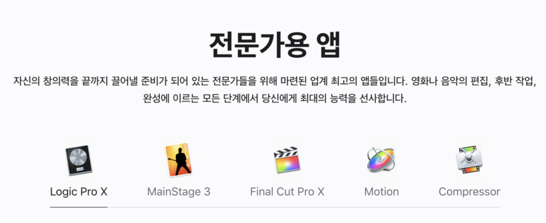 당신이 파이널 컷 프로, 로직 프로, 모션 등 Mac OS 전용 프로그램이 필요한 사람이라면 대체재는 없다. 어떤 맥 컴퓨터를 구매할지만 고민하면 된다. 사진 속 프로그램은 Mac OS 전용 프로그램이므로 맥 컴퓨터에 최적화되어있고, adobe 프로그램들과는 다르게 한 번만 구매하면 지속적으로 프로그램 업데이트도 받을 수 있다.