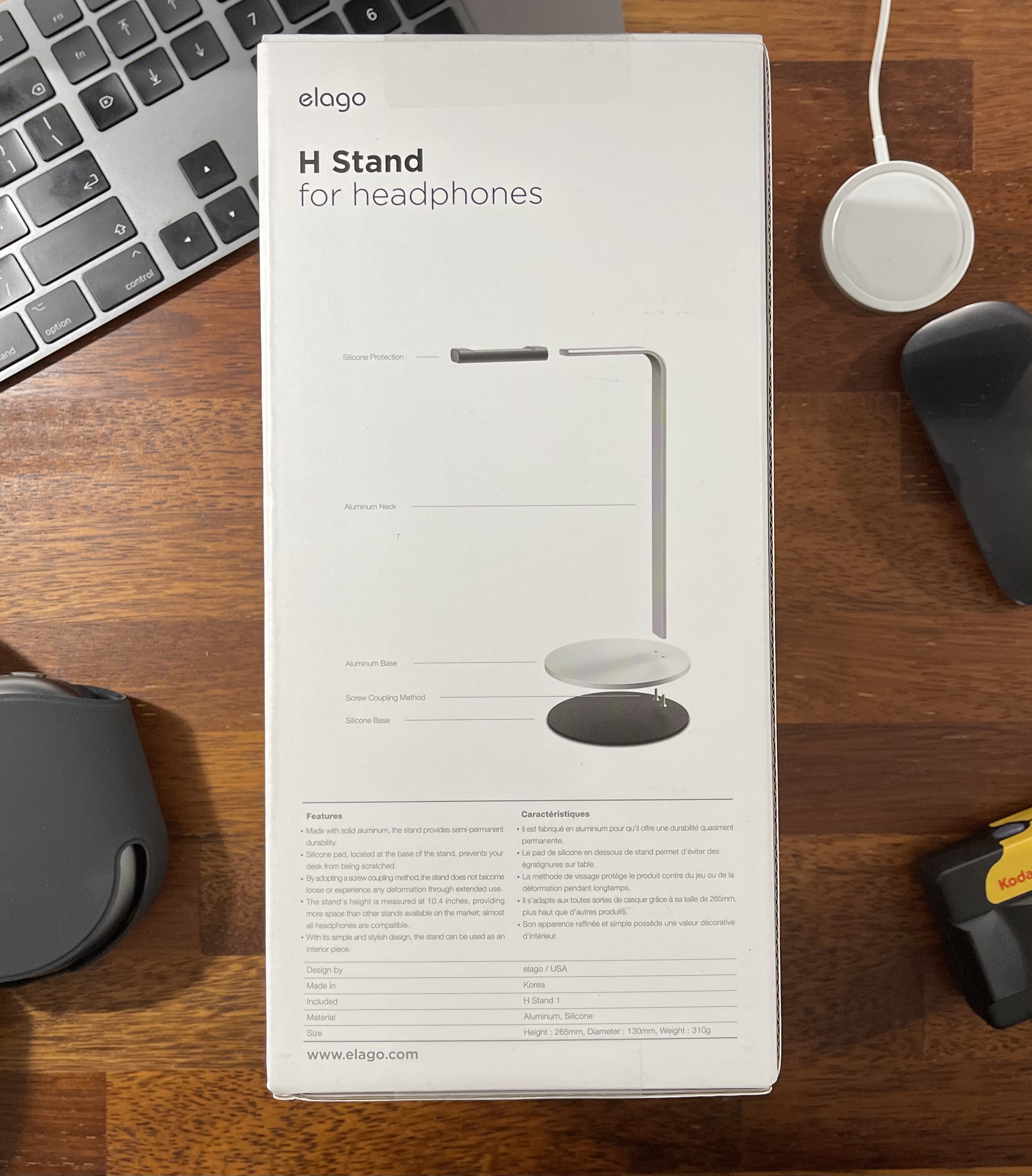 지난 설 에어팟 맥스를 구매하며 깨달은 것이 있다. 바로 헤드폰을 둘 곳이 마땅히 없다는 것이다. 책상에 눕혀놓자니 부피가 커 자리를 많이 차지하고 모니터나 의자에 걸어 놓을 수도 없다. 그래서 헤드폰과 어울리는 거치대를 찾아보다 엘라고 H 스탠드를 구매하였다. 가격은 쿠팡 기준 44,000원이다.