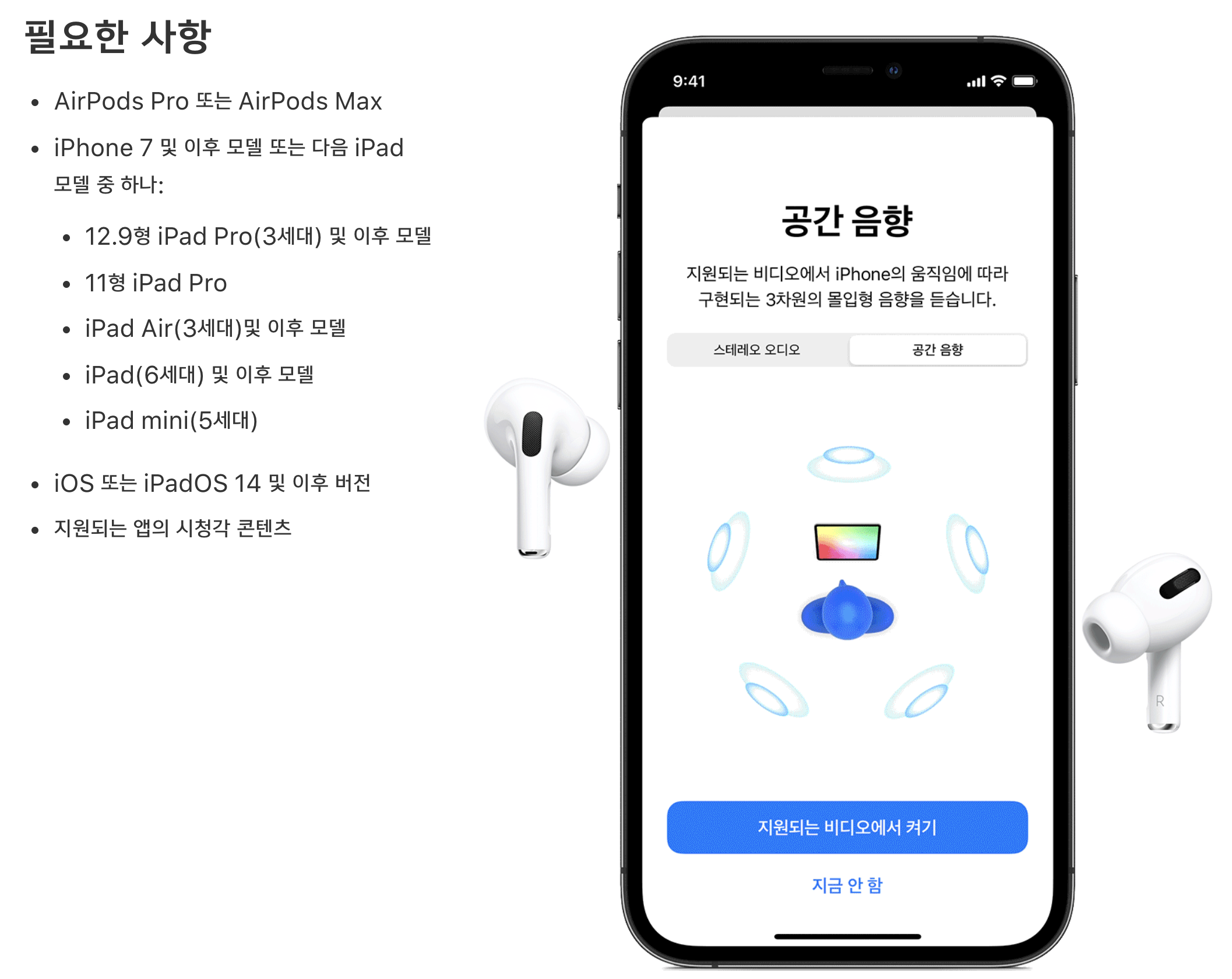 공간 음향은 돌비 애트모스와는 다르다. 사용자 머리의 움직임을 읽을 수 있어야하기 때문에 관련 센서와 기술적 처리가 가능한 제한적인 기기에서만 체험이 가능하다. 즉 나중에 국내 도입된 플랫폼이 공간음향 업데이트를 한다 하더라도 티비와 컴퓨터로는 공간음향을 체험할 수 없다는 뜻이다. 필자가 조사한 결과 아이폰이나 아이패드를 hdmi 혹은 Airplay로 티비와 연결한다 하더라도 공간음향은 사용할 수 없다.