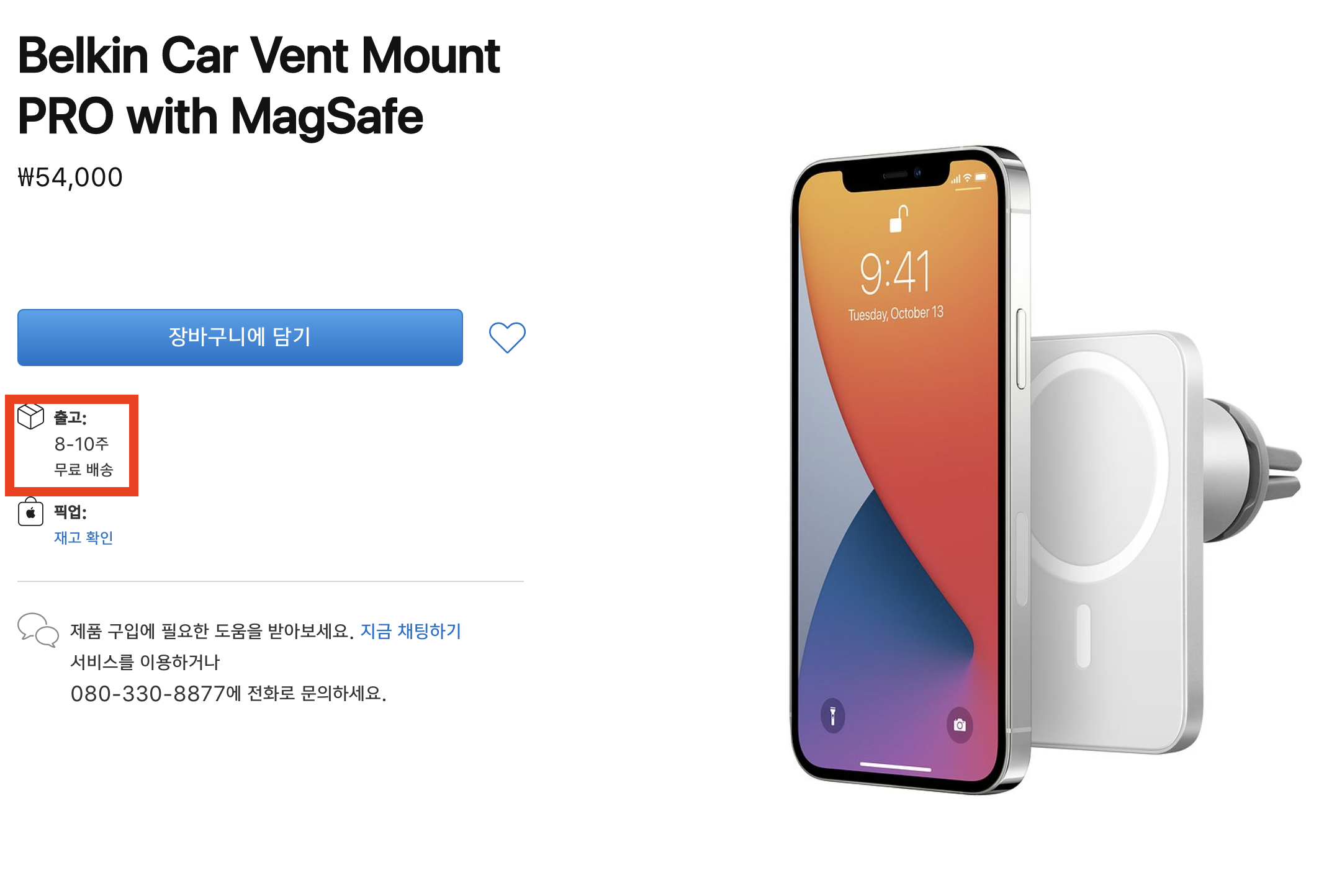 그럼 자력이 유용한 상황은 언제일까? 바로 아이폰을 거치해야 할 때다. 차 안에서 맥세이프를 활용하면 더욱 깔끔하게 아이폰을 거치할 수 있다. 보편적인 차량용 거치대는 휴대폰을 받치고 양옆에서 잡아주기 때문에 깔끔한 모양을 하기 힘들다. 또 제품이 단단하지 못해 소음이라도 나면 운전 중에 계속 거슬리게 된다. 자력으로 붙이고 충전까지 되는 깔끔한 차량용 거치대를 기다리는 사람이 굉장히 많았다는 것은 애플 공식 홈페이지의 벨킨 맥세이프 거치대의 배송일정을 보면 알 수 있다. 무려 8~10주나 걸린다. 차량용 거치대도 구매하게 되면 리뷰를 남길 수 있도록 하겠다.