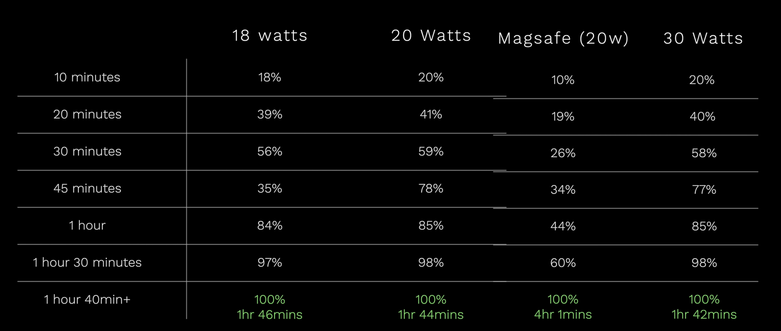 그렇다면 충전 시간은 얼마나 걸릴까? 맥세이프 충전기 기준 0%부터 100% 까지 무려 4시간 1분이나 걸린다. 20W 유선 충전기를 사용했을 때 보다 약 2.5배 긴 시간이다. 스펙 상 15W 충전이 가능하다 하더라도 무선 충전에는 한계가 있음을 알 수 있다. 알다시피 아이폰은 아직까지 라이트닝 포트를 탑재하고 있다. 필자는 아이폰이 USB-c 포트 대신 MagSafe를 먼저 내놓은 걸로 봤을 때, USB-c 포트를 스킵하고 포트리스 아이폰을 먼저 출시할 것이라 예상한다. 하지만 이런 충전 속도라면 포트리스 아이폰은 최소 3년 후에나 가능할 것 같다.