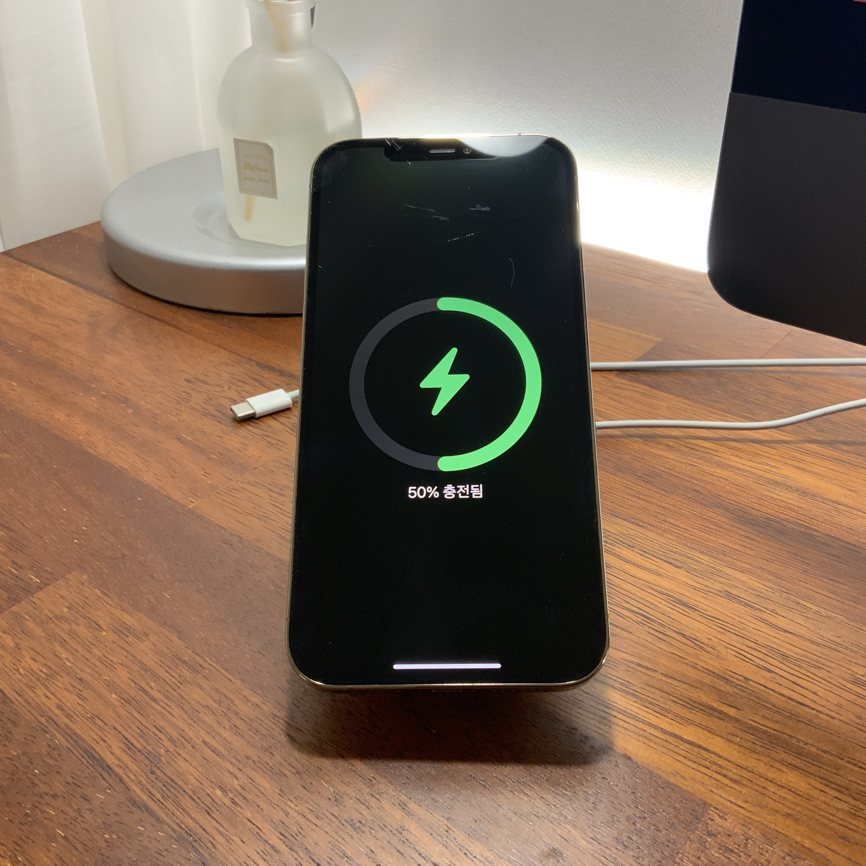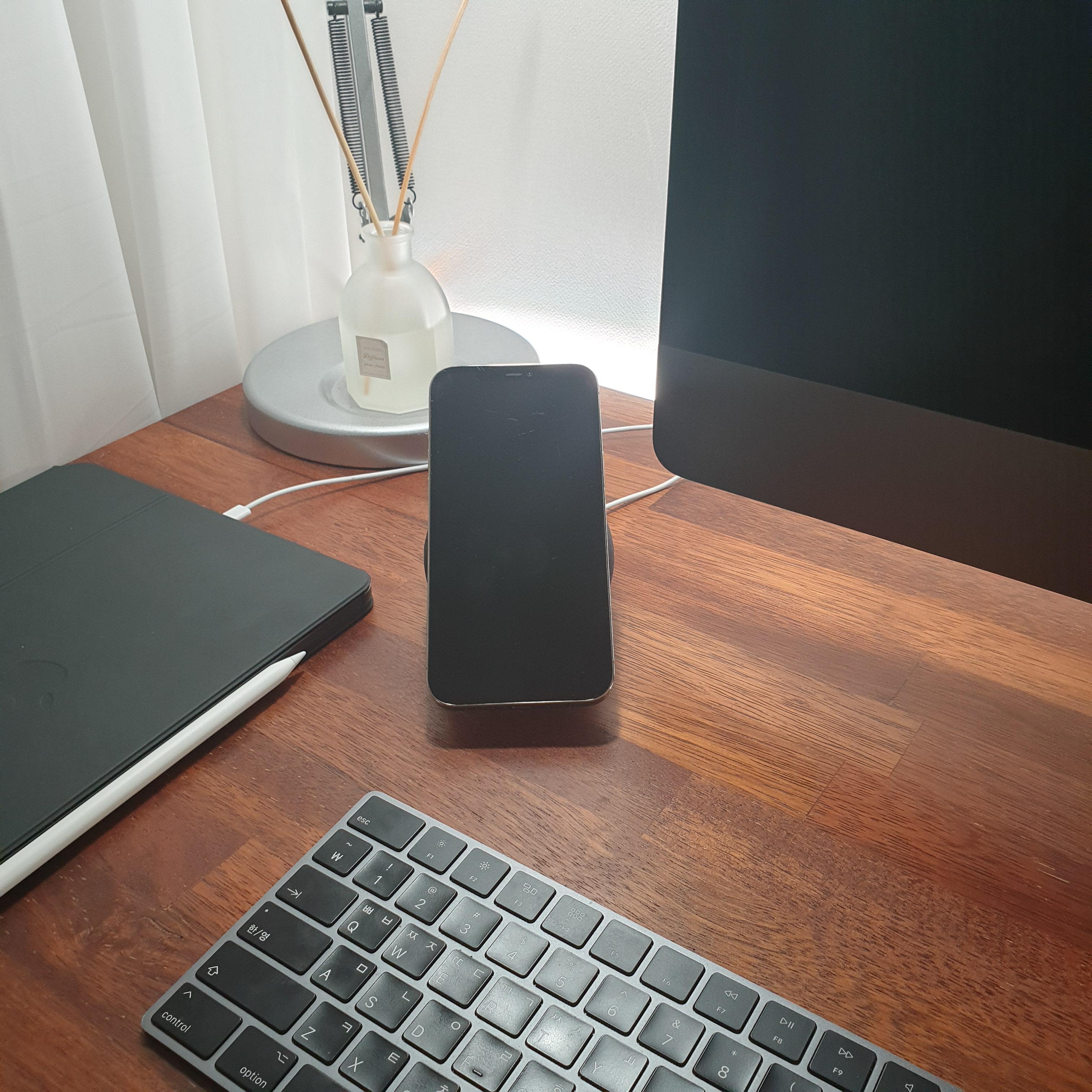 당연히 충전은 잘되고 거치대의 각도 때문에 이제 책상에서도 편하게 아이폰을 볼 수 있다. 맥세이프 충전기의 첫 번째 불편함은 해결한 것이다.