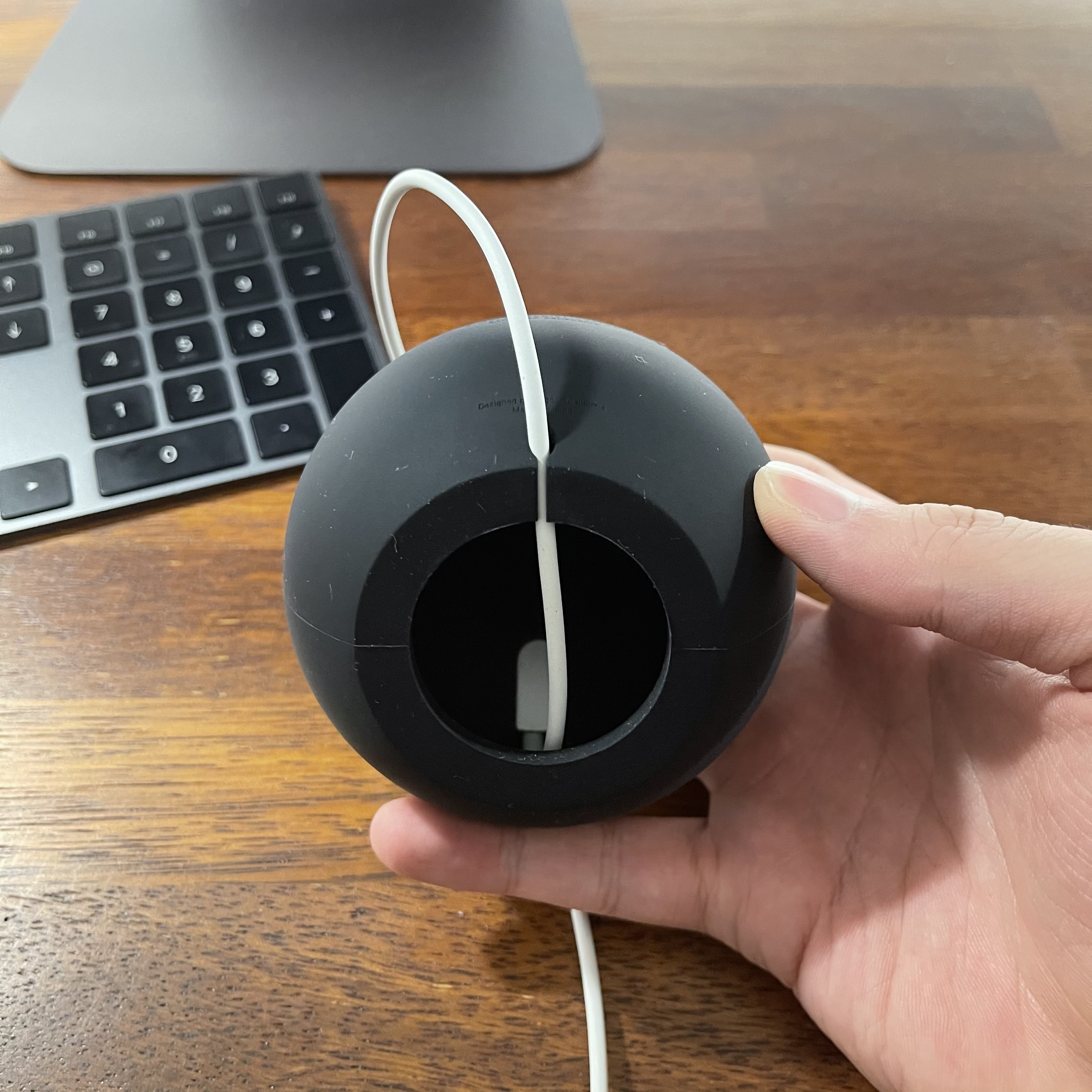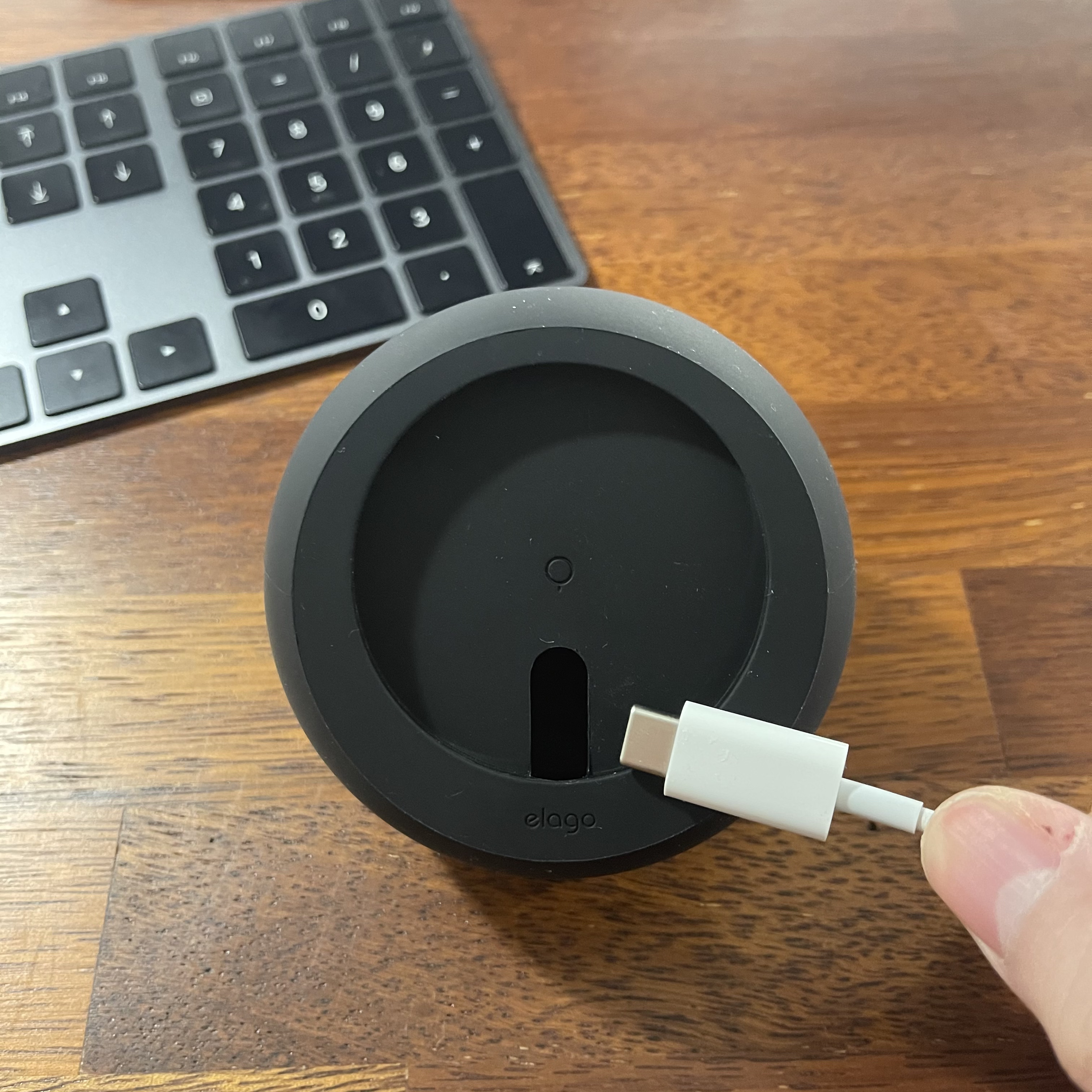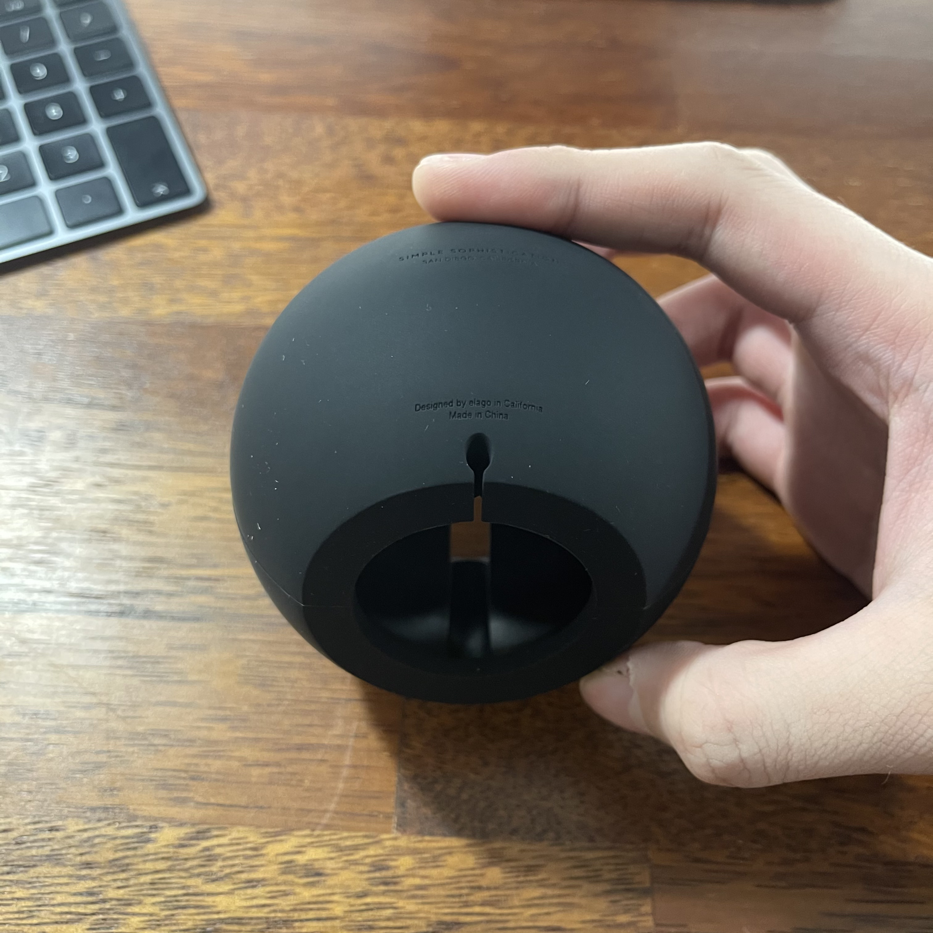 전면에는 맥세이프 충전기가 들어갈 자리와 케이블을 통과시킬 구멍이 있고 뒷면에도 케이블을 통과시킬 홈이 있다. 맥세이프 충전기의 자력이 강하기 때문에 필자는 거치대의 무게가 가볍지 않기를 바랬고, 무게감이 있어 마음에 들었다.
