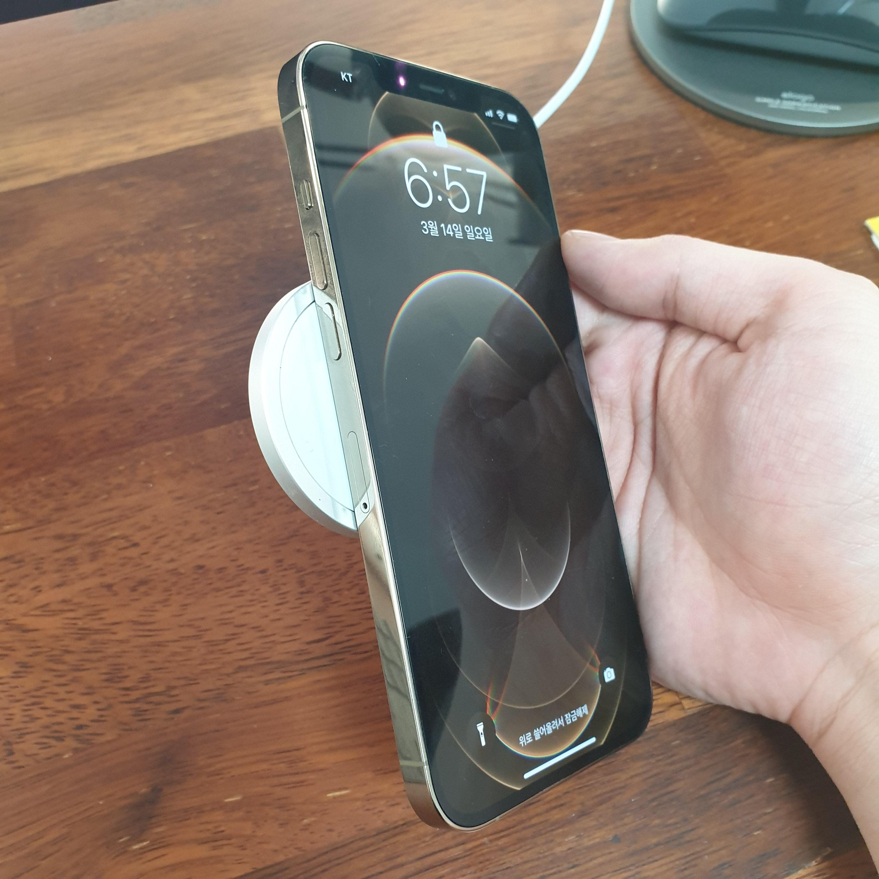 서두에 설명하였듯이, 충전을 하다가 아이폰을 사용할 때는 위 사진처럼 항상 손가락으로 맥세이프 충전기를 떼어줘야 했다. 하지만 이젠 거치대의 무게와 미끄러지지 않는 고무이기 때문에 아이폰을 잡고 아래쪽부터 떼어내면 쉽게 떨어진다.