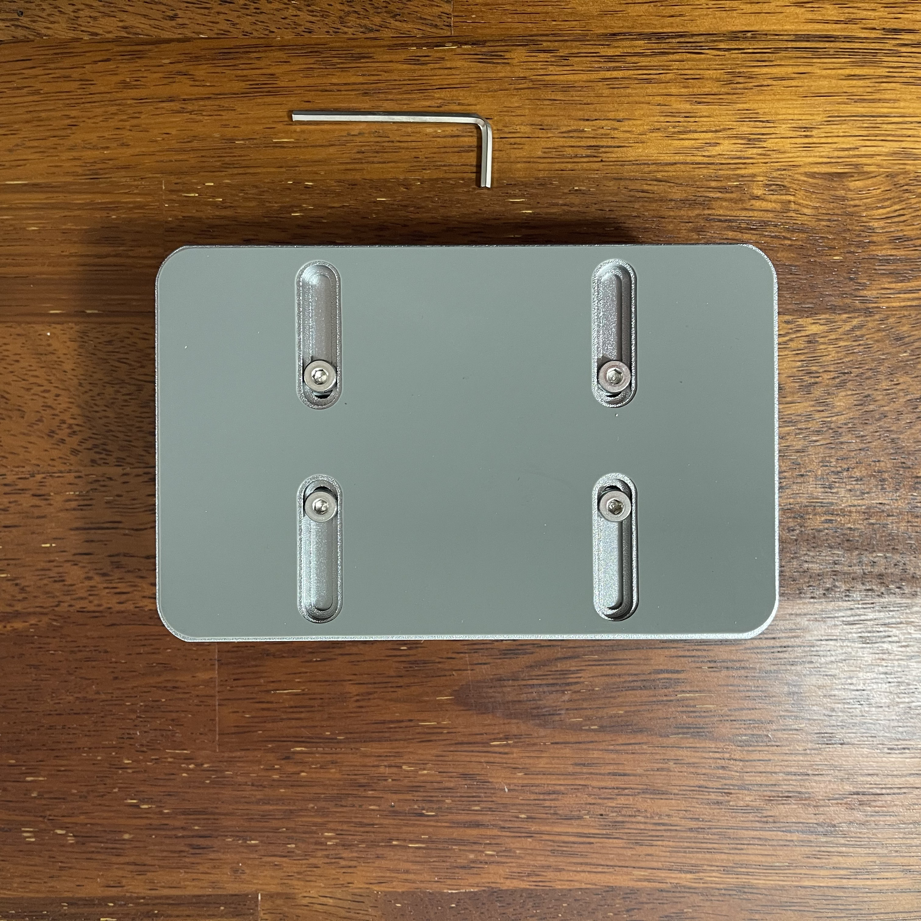 거치대 하단은 미끄러지지 않도록 고무로 처리되어 있다. 너비 조절은 하단의 육각 볼트 4개로 할 수 있다.