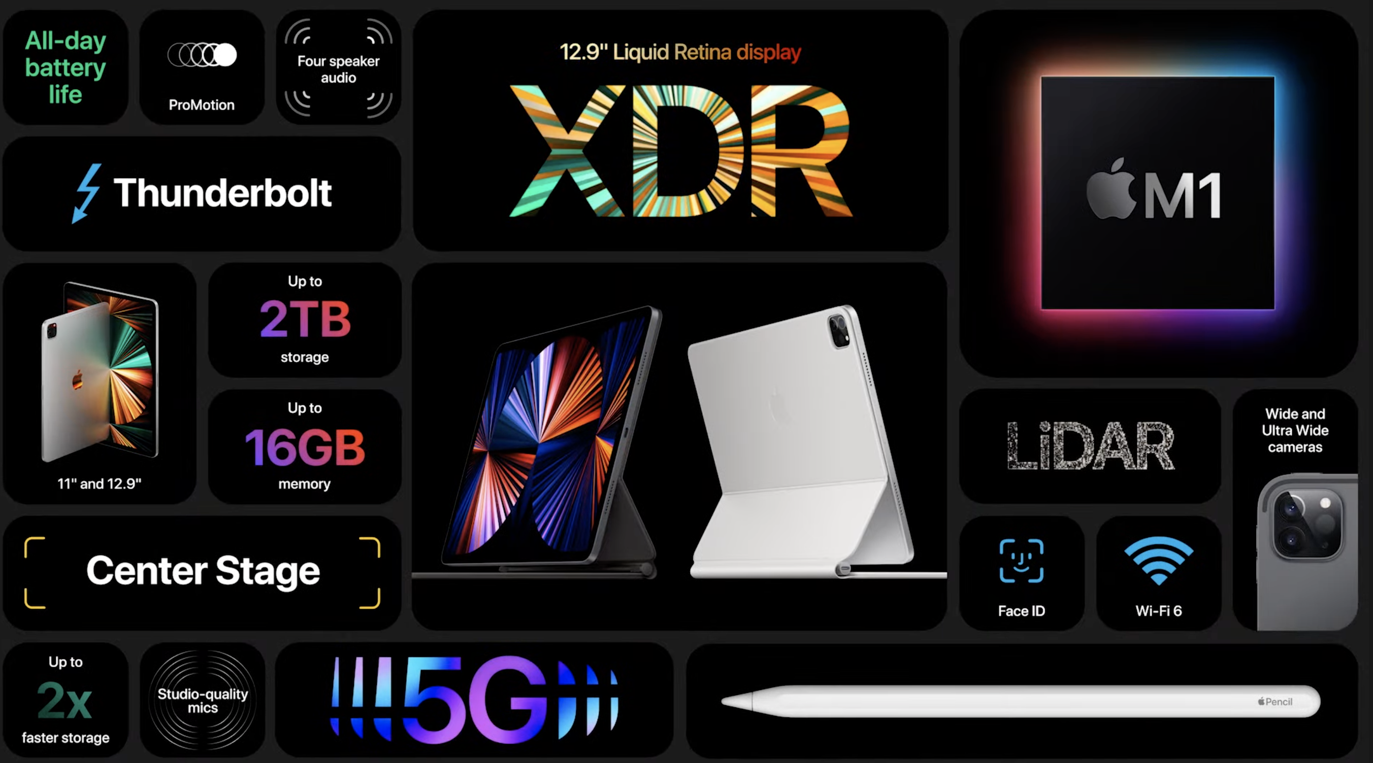 아이패드에도 M1이 탑재된다. 기존 아이패드 프로보다 50% 빠른 8 코어 CPU, 기존보다 40% 빠른 8코어 GPU가 탑재된다. 최신 PS5, 엑스박스 컨트롤러를 지원하며, 5G까지 사용 가능하다. 최대 용량은 2 테라로 늘었다. 무엇보다도 이제 아이패드 프로에도 썬더볼트 포트가 탑재된다.