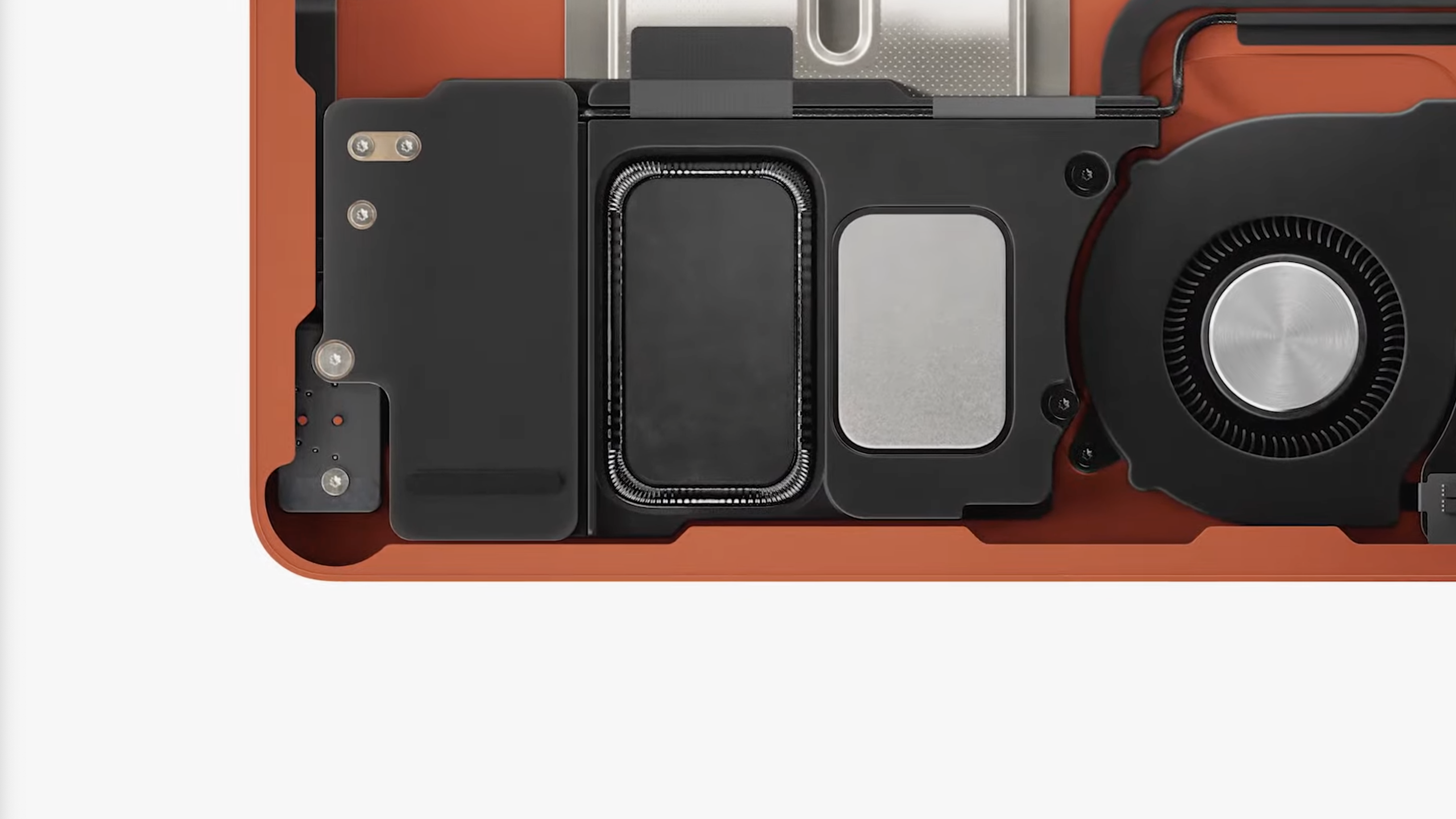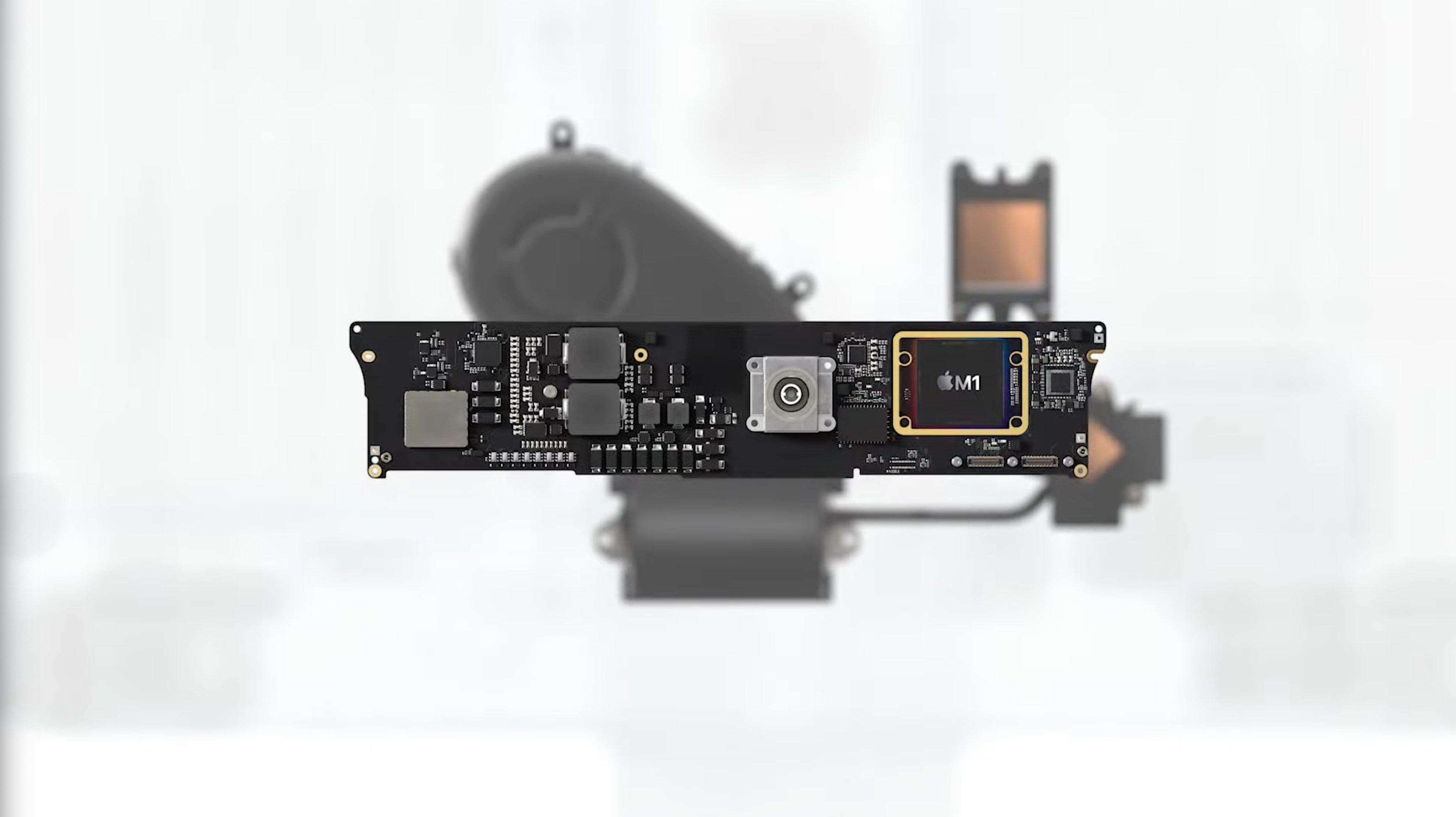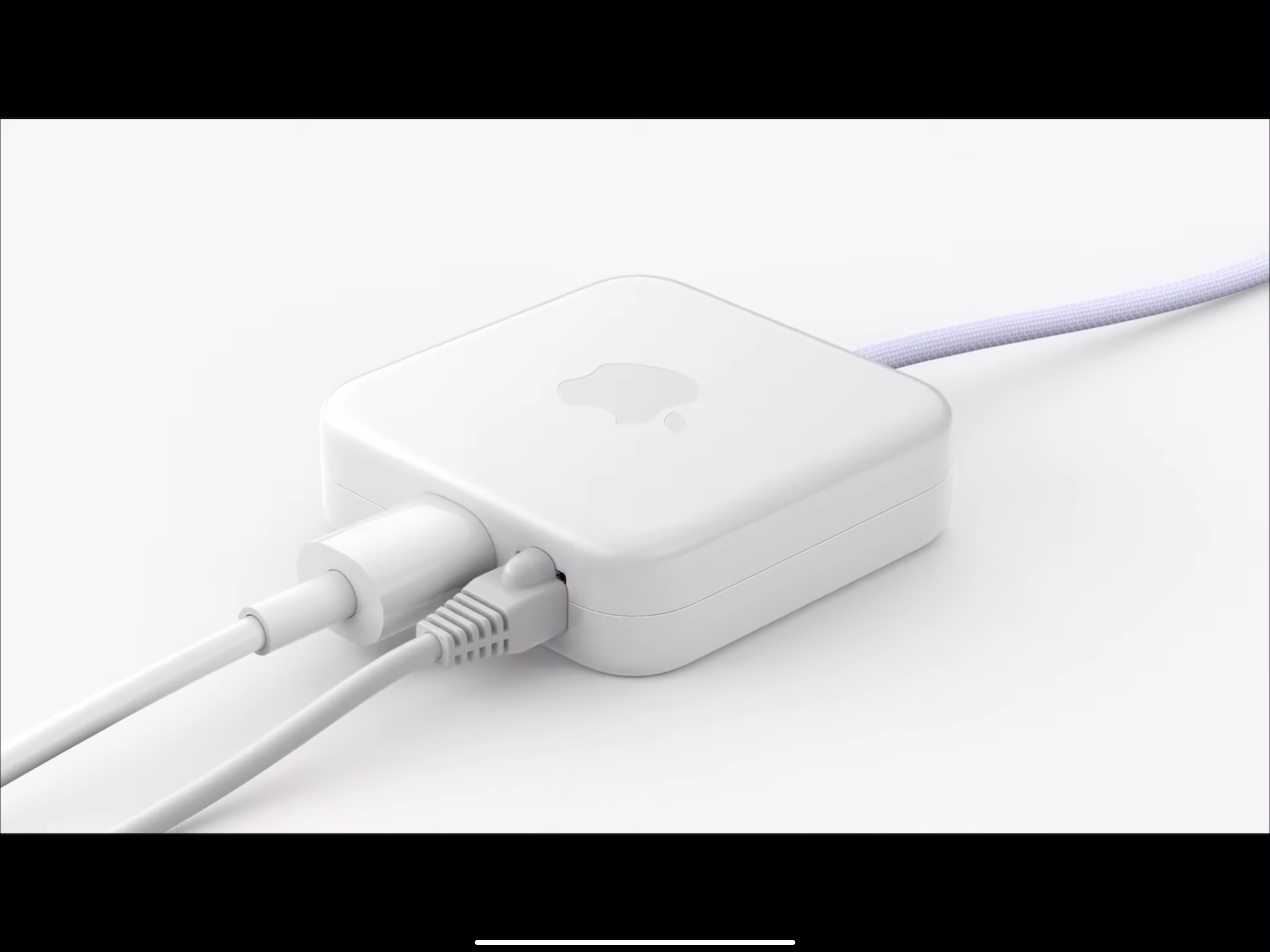 M1 덕분에 엄청 작아진 로직보드가 엄청 작아졌고 작은 두 개의 팬이 설치되어 있으며 10 데시벨 이하로 소음 유지가 가능하다. usb-c 2개, 썬더볼트 포트 2개가 탑재된다. 인터넷 포트는 기존 후면이 아닌 파워 브릭에 꽂는 형식이다.