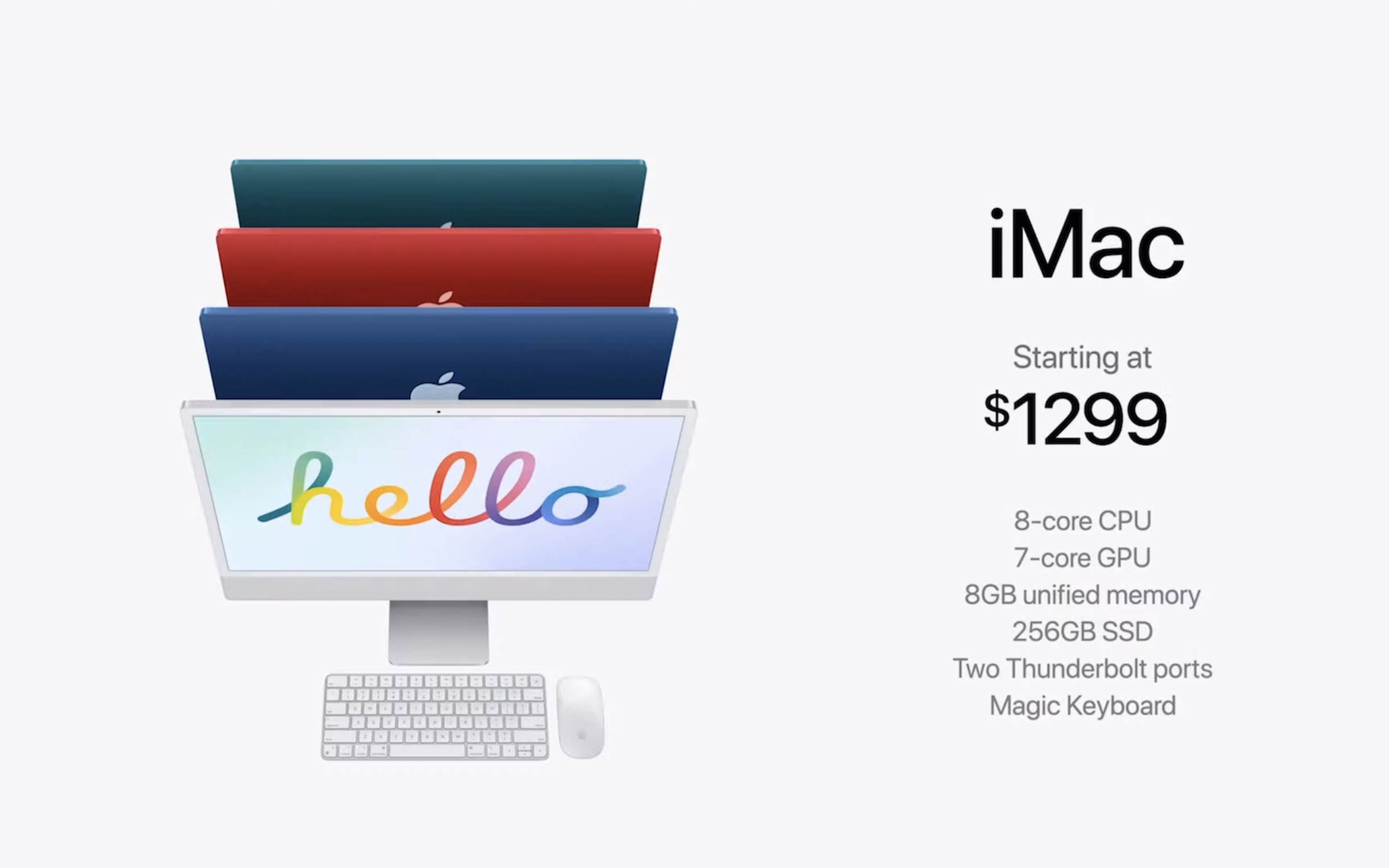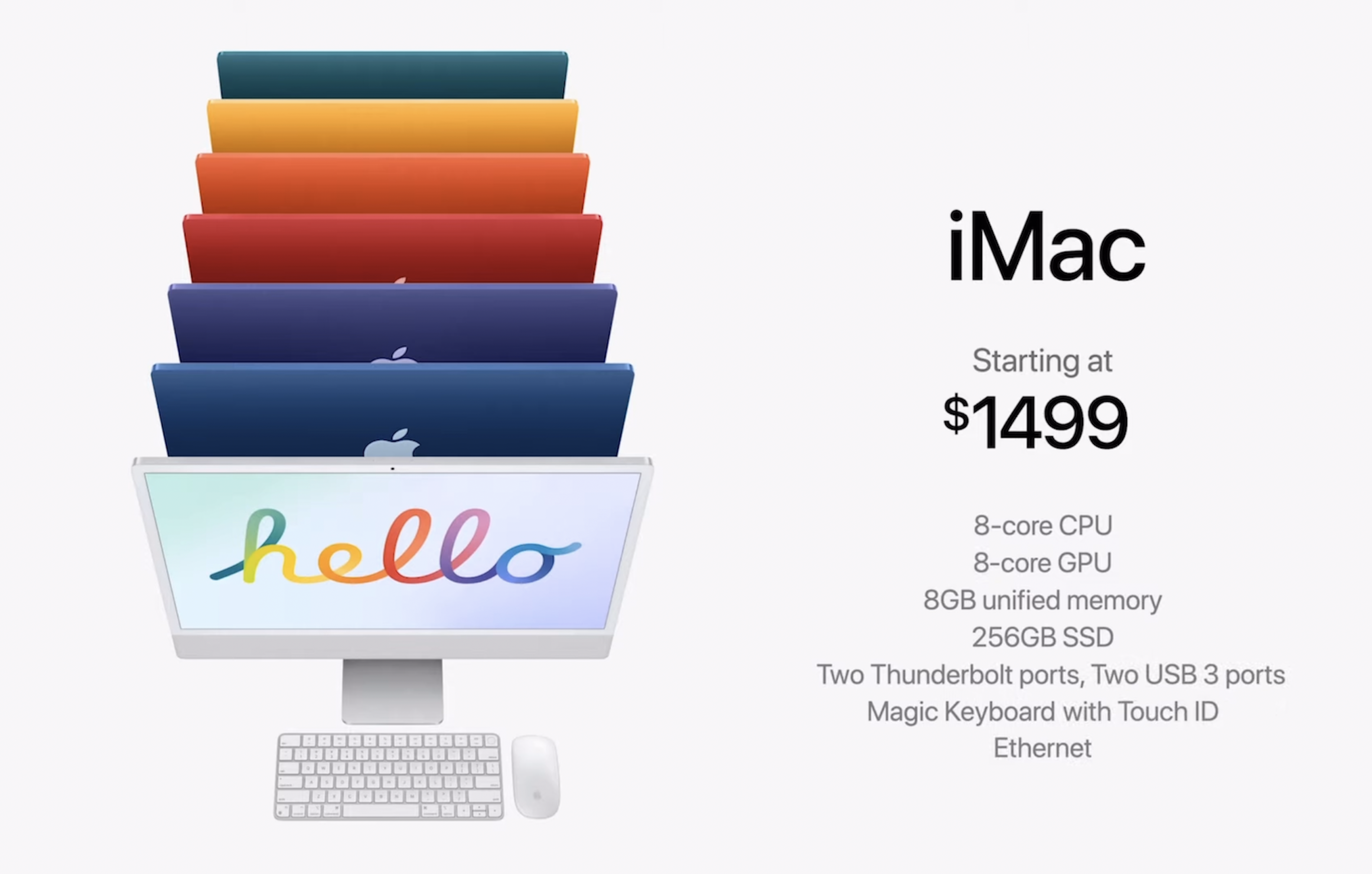 아이맥에 M1이 탑재된다. 흰색, 초록, 노랑, 주황, 빨강, 보라, 파랑 총 7가지 색상으로 출시된다. 전면 배젤이 줄었고, 전면 애플 로고는 삭제되었다. 프로 디스플레이 XDR 같은 각진 스타일이다.