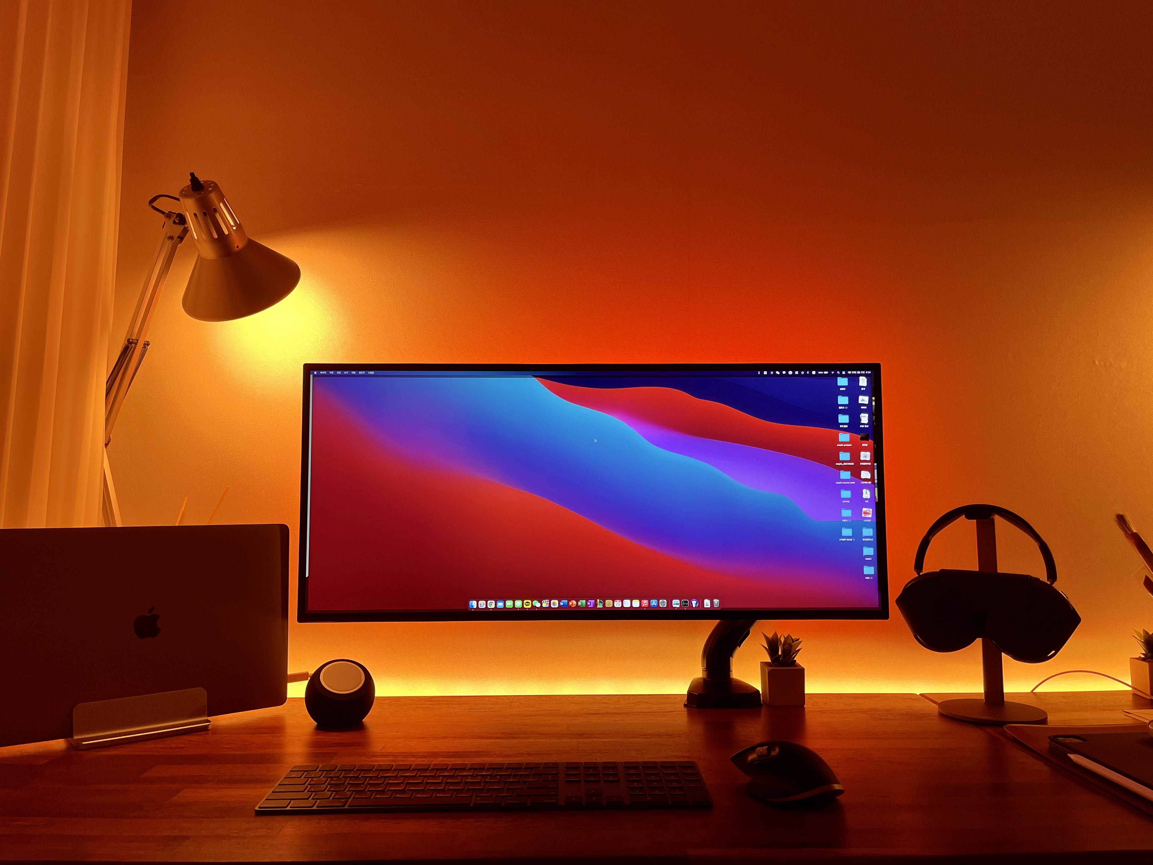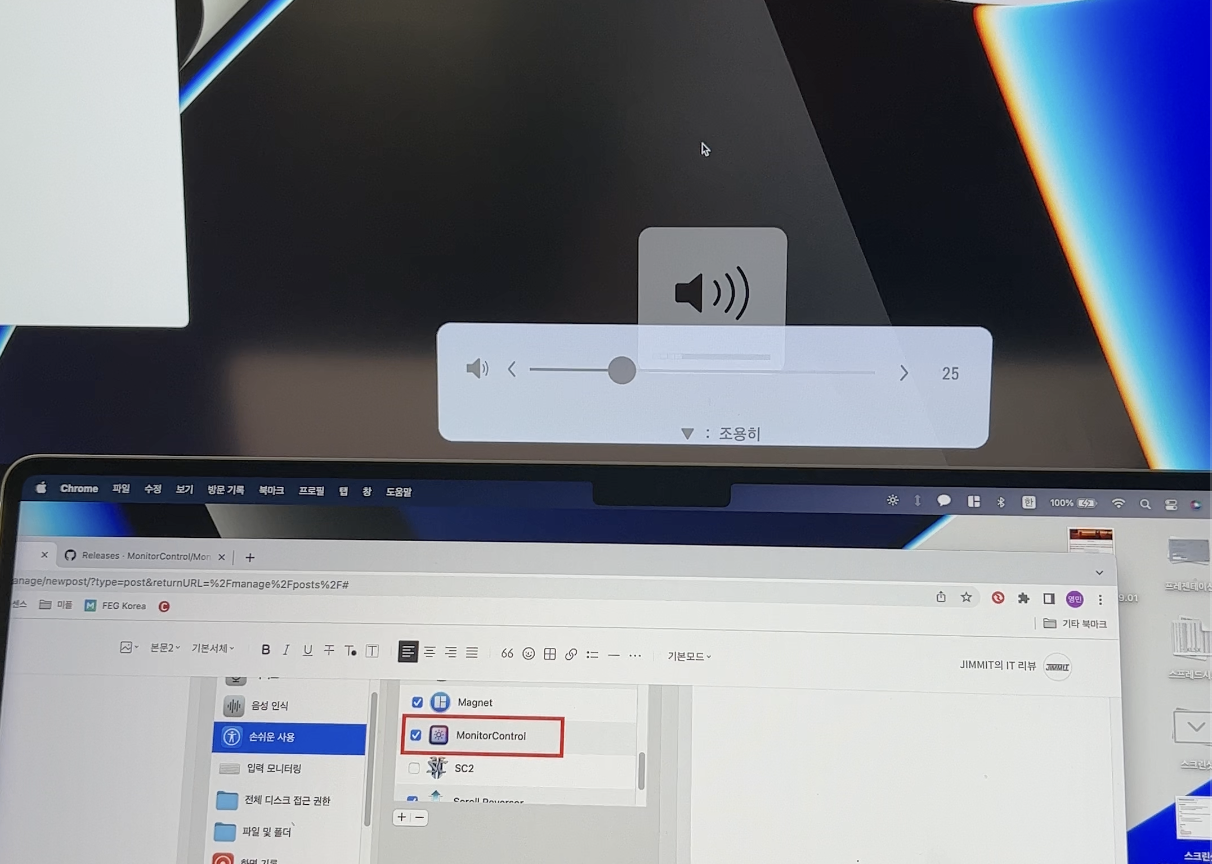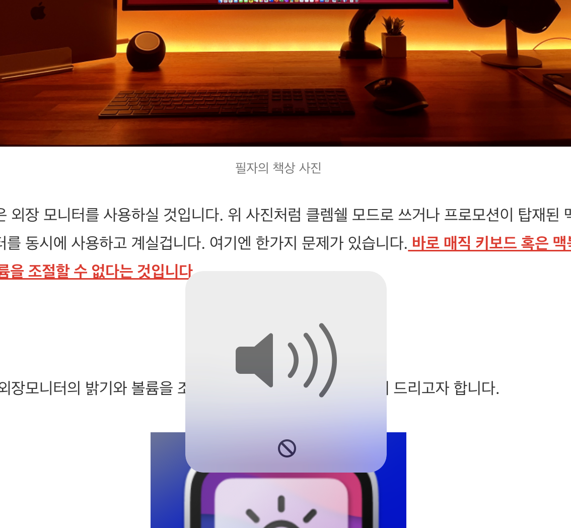 대부분의 맥북 유저분들은 외장 모니터를 사용하실 것입니다. 위 사진처럼 클렘쉘 모드로 쓰거나 프로모션이 탑재된 맥북 사용자 대부분은 맥북 스크린과 외장 모니터를 동시에 사용하고 계실 겁니다. 여기엔 한 가지 문제가 있습니다. 바로 매직 키보드 혹은 맥북의 키보드로는 외장모니터의 스피커 볼륨을 조절할 수 없다는 것입니다.