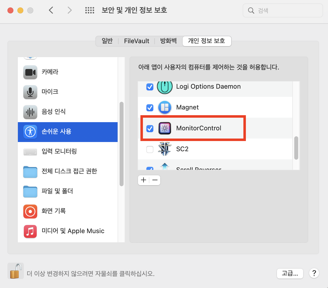 모니터 컨트롤이 '손쉬운 사용'에 접근을 요청하면 설정 - 보안 및 개인 정보보호 - 손쉬운 사용으로 들어가 모니터 컨트롤을 추가해줍니다. 이제 모든 준비는 끝났습니다.