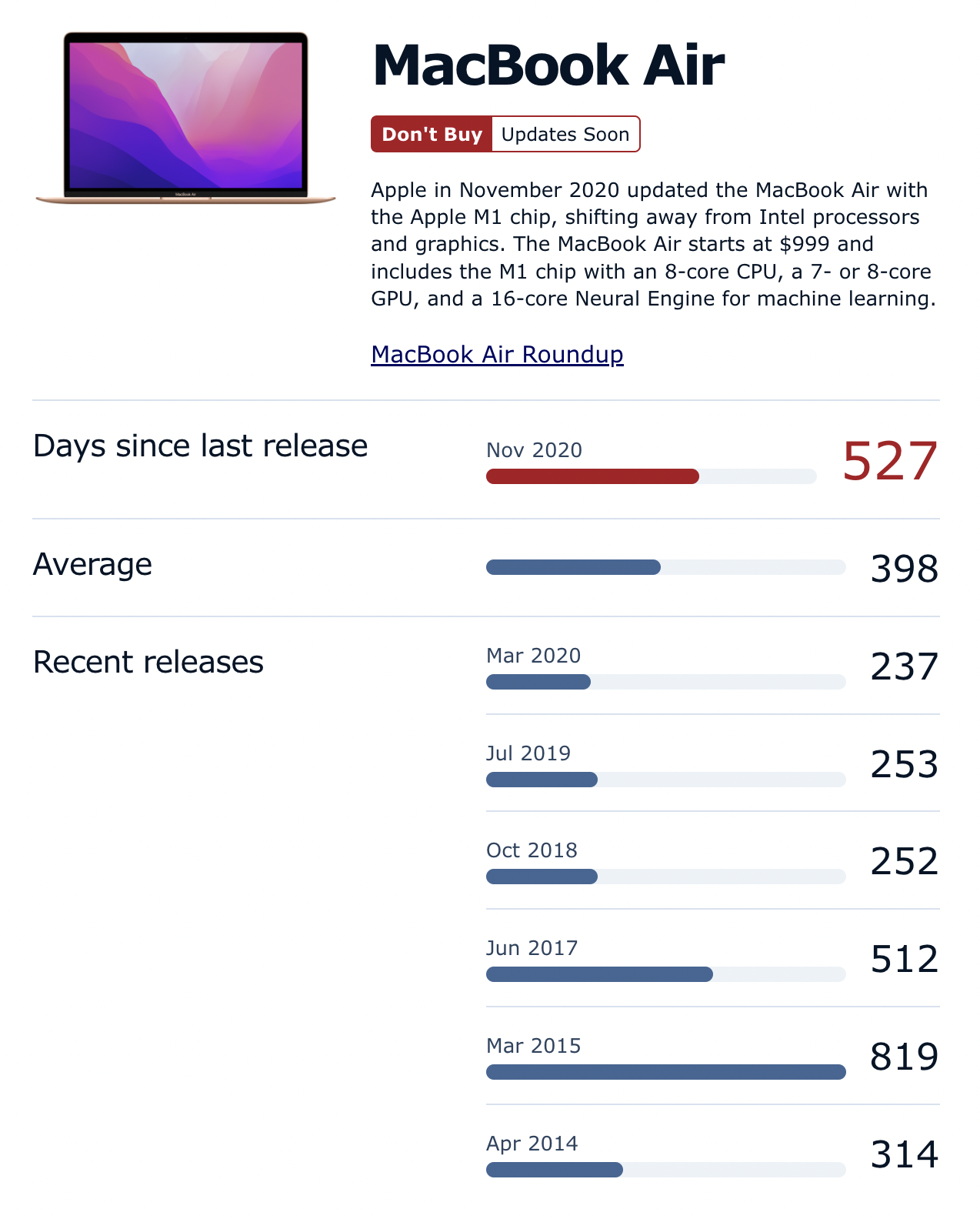 2022년 4월 22일 기준 M1 맥북 에어가 출시된 지 527일이 되었습니다. 이는 398일인 평균 출시 주기보다 훨씬 긴 기간이며 역대 두 번째로 긴 기간입니다. 그렇다고 바로 다음 대형 이벤트에서 M2 맥북 에어가 출시되지는 않을 것이라고 예상합니다. 왜냐하면 구형 모델로 만들어버리기에는 M1의 전성비, 발열 관리, 성능이 타 윈도우 랩탑을 압도하기 때문입니다. 이미 시장을 압도하고 있는 만큼 애플이 안정적인 추가 수익을 포기할 필요는 없습니다. 그렇기 때문에 WWDC와 같은 다음 대형 이벤트가 아닌, 9월 쯤 별도의 이벤트를 통해 소개될 것이라 예상합니다. Macworld, 밍치쿼, 9 to 5 Mac 등 거의 모든 전자제품 정보 매체 및 전문가들 또한 M2 맥북 에어가 2022년 3분기, 가을에 출시될 것이라 예상하고 있습니다. 그럼 발표 이후 전파인증 등을 거쳐 한국에서 실제로 구매가 가능한 시기는 2022년 10월 말 ~ 11월 초가 될 것이라 예상합니다.