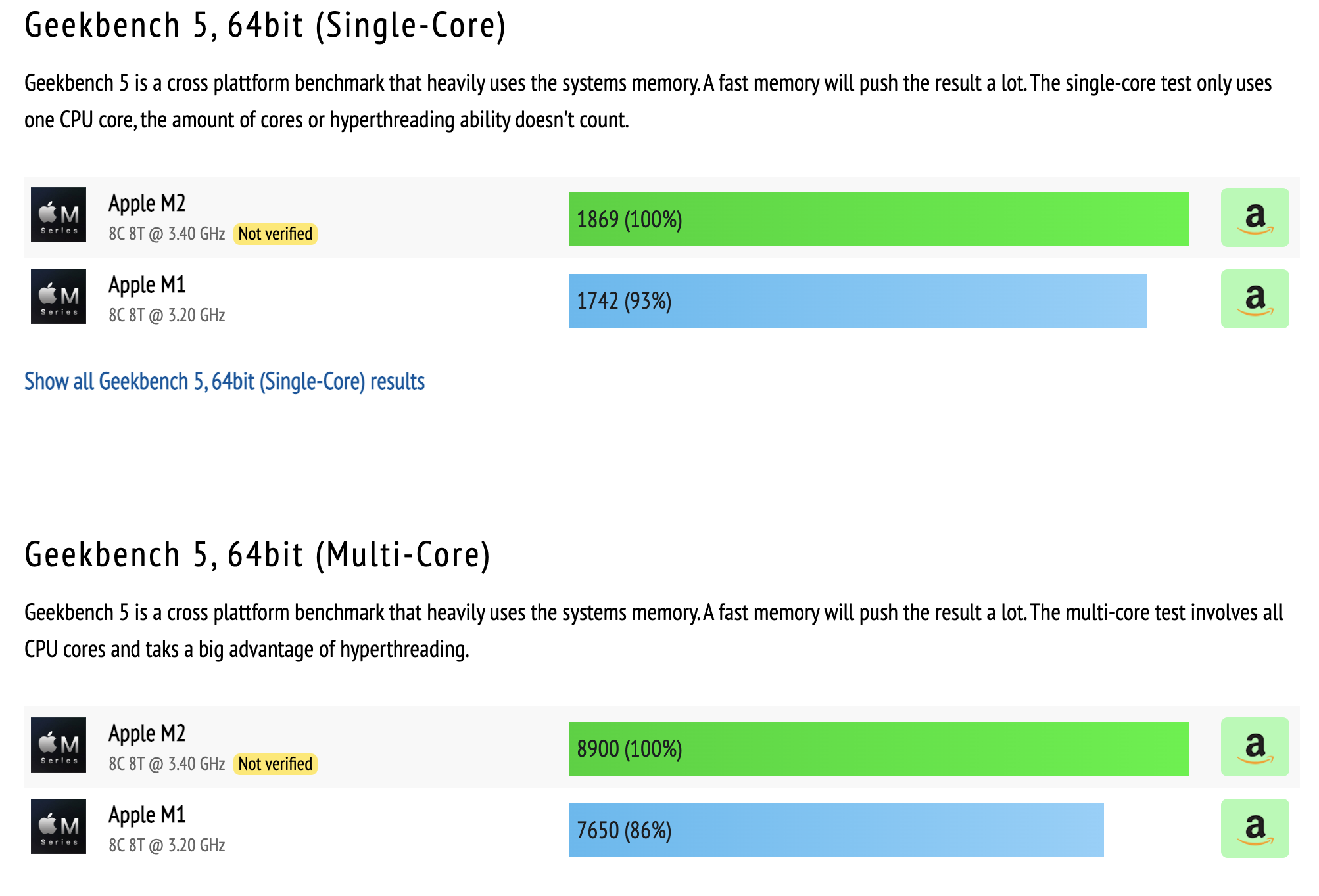 긱벤치 5 점수로는 싱글코어 성능이 약 7.3%, 멀티코어 성능이 약 16.3% 증가할 전망입니다. 인텔에서 M1으로 넘어왔을 때보다는 현저히 적은 성능 향상 폭이지만 기존 인텔 CPU들의 성능 향상폭을 생각해보면 이는 준수한 성능 향상이라 할 수 있습니다. M2라고 해서 드라마틱한 성능 향상을 기대하기 힘든 이유는 첫 번째로는 공정의 변화가 없이 그대로 5 나노미터 공정이라는 점이며 두 번째로는 '프로' 모델보다 뛰어난 성능의 칩을 맥북 에어에 탑재할 수는 없기 때문입니다.