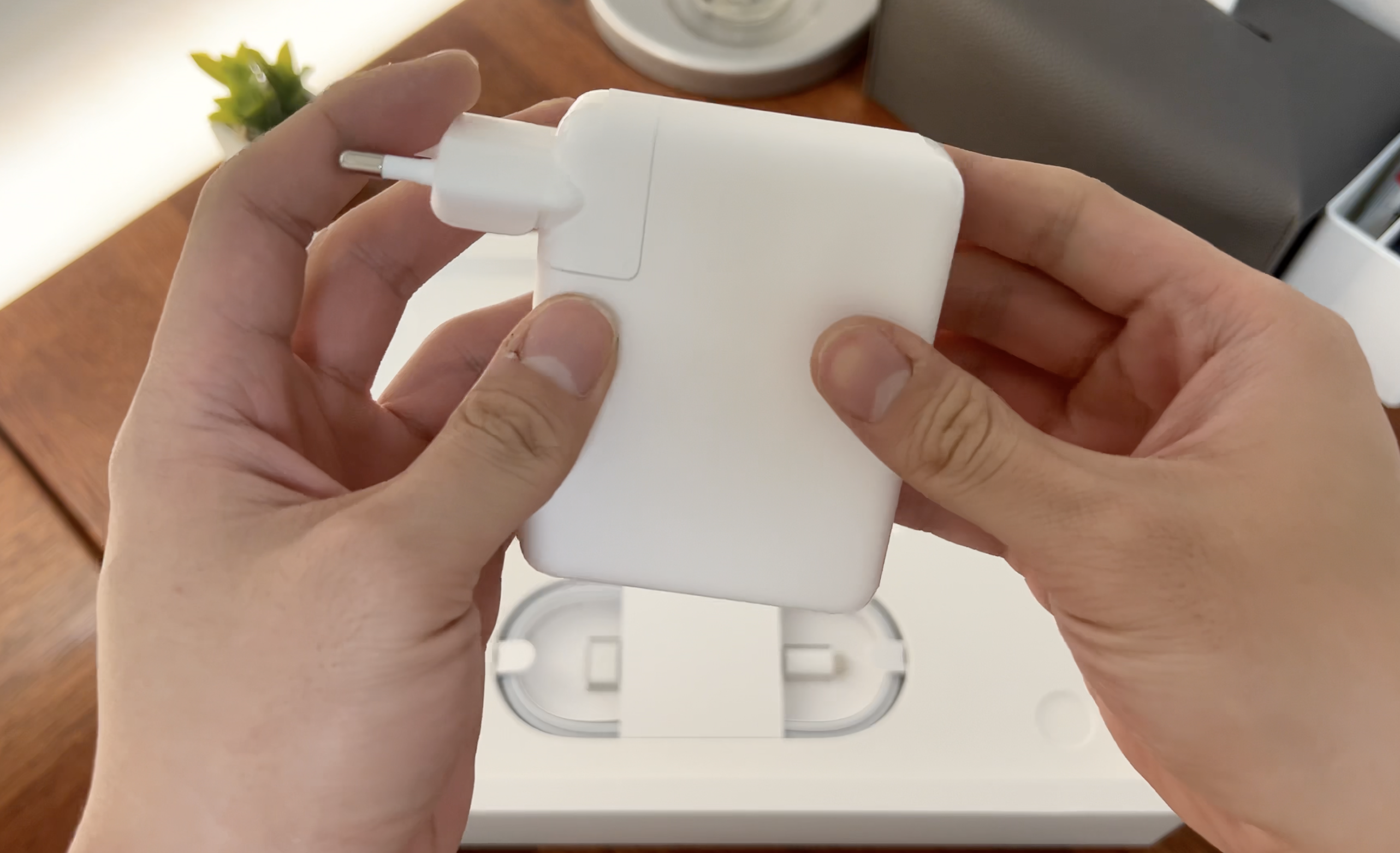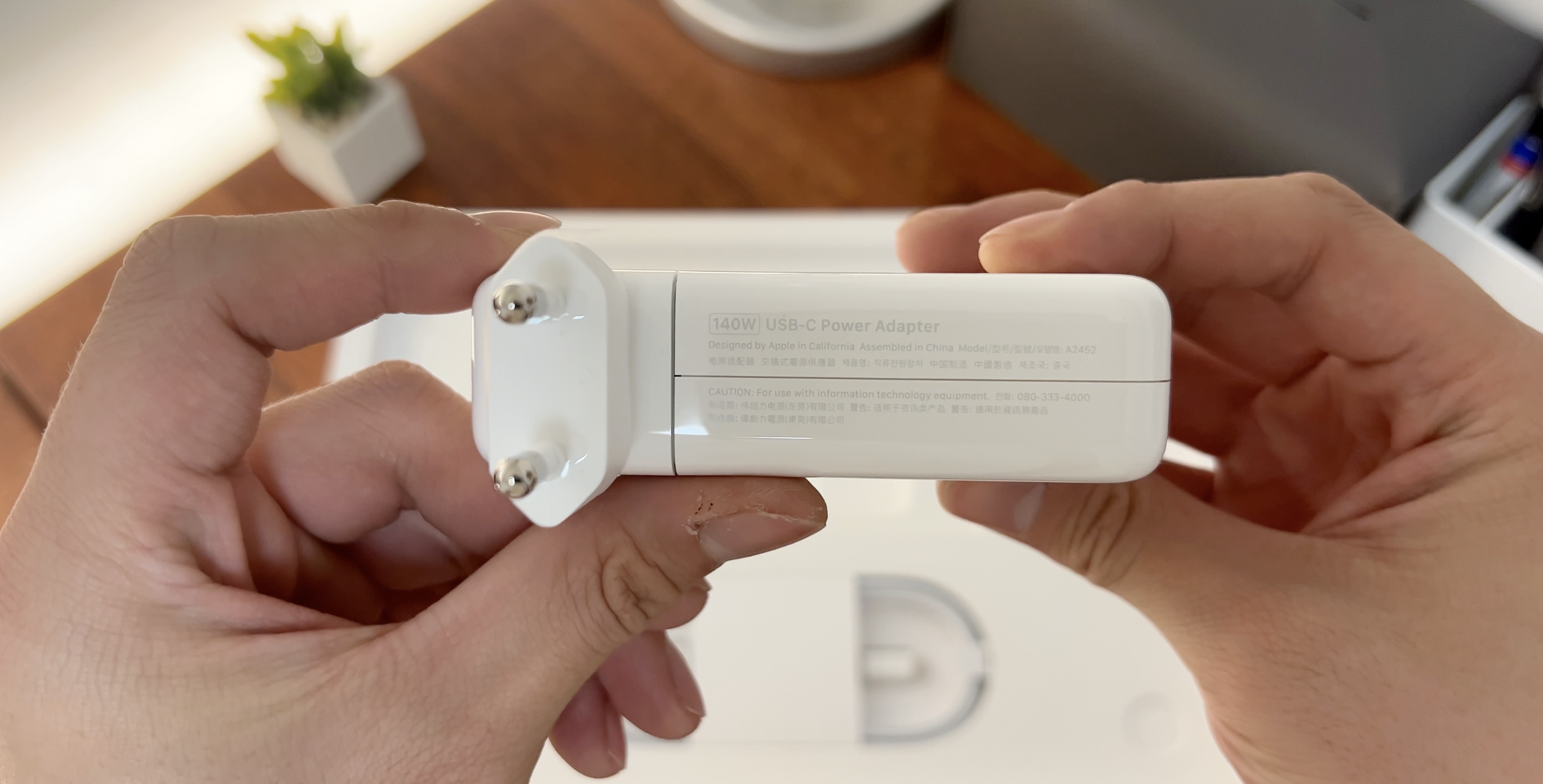 전원 어댑터는 애플 모바일기기 제품 중 가장 큰 출력인 140W 어댑터가 동봉되어 있습니다. 출력만큼이나 크기가 거대하며 세로로 긴 모양을 갖고 있습니다. 충전기의 무게는 277g으로 꽤나 묵직합니다. 140W 전원 어댑터로 충전을 할 경우 30분에 50%까지 급속 충전을 할 수 있습니다. 140W 전원 어댑터를 별도로 구매할 경우 가격이 109,000원에 달하니 절대 잃어버리지 않도록 합시다.