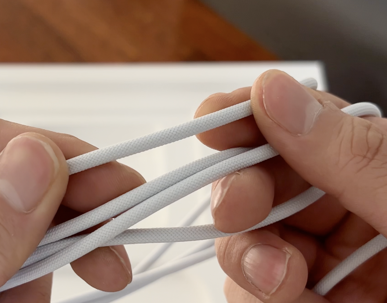 충전 케이블은 패브릭으로 되어있어 질감이 매우 좋습니다. 24인치 아이맥을 시작으로 애플의 전원 케이블이 모두 패브릭으로 바뀌기 시작하였는데 맥북 프로 16인치에도 패브릭 충전 케이블이 동봉되었습니다.