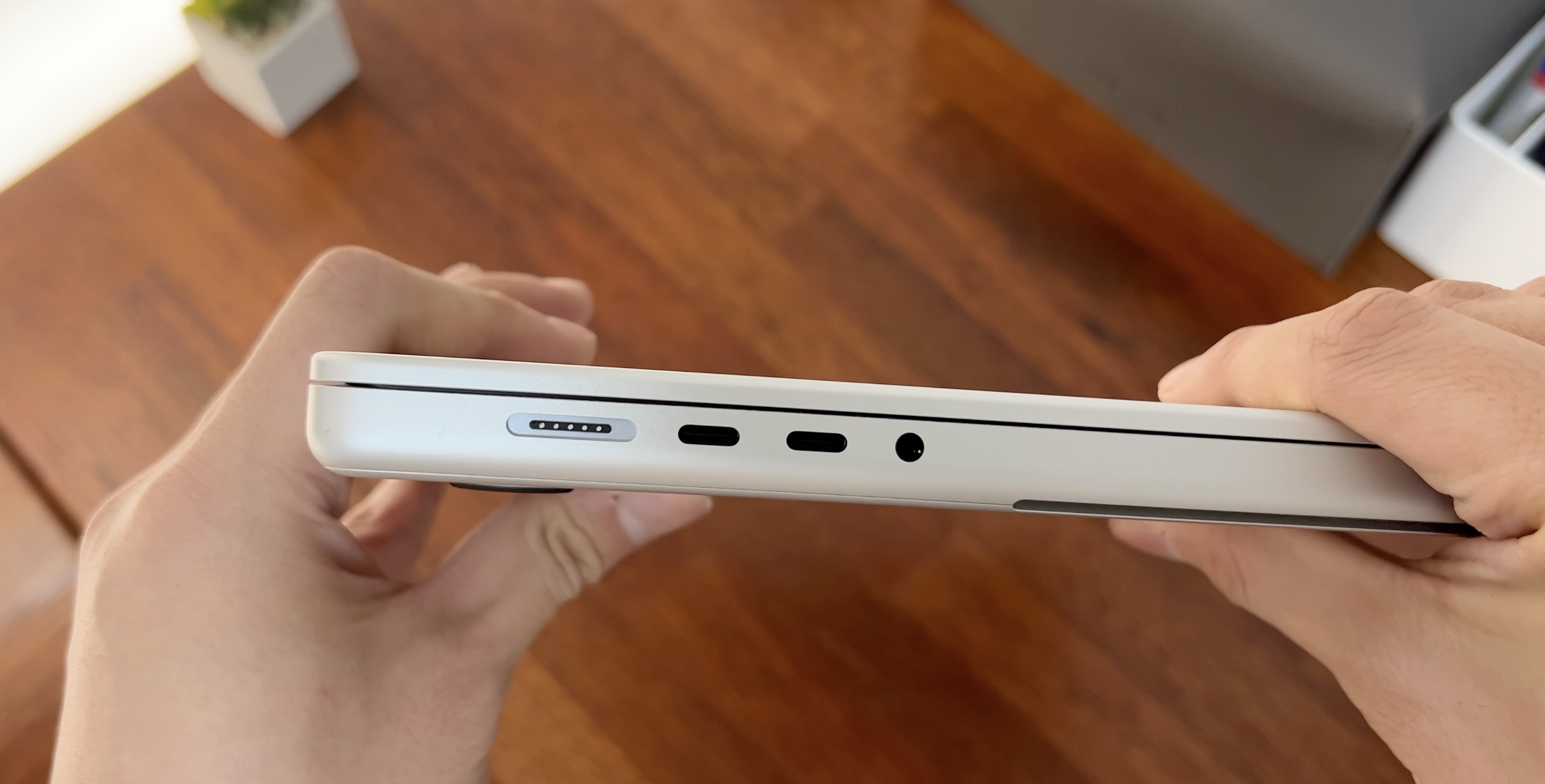 본체 좌측에는 맥세이프 전원 포트와 썬더볼트 포트 2개, 3.5mm 이어폰 잭이 탑재되어있습니다. 옆에서 바라봤을 때 두께가 상당함을 알 수 있습니다.