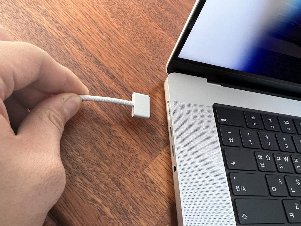 맥세이프 충전기를 사용해 보며 가장 크게 든 생각은 '생각보다 정확하게 붙지 않는다'이며 두 번째로는 '자력이 생각보다 강하다'입니다. 케이블 헤드를 전원 포트에 가져다 두면 자동으로 딱 맞춰 붙을 것 같지만 많은 경우 대각선으로 붙어서 다시 정확히 맞춰줘야 했습니다. 또한 케이블을 위아래로 잡아당길 경우 생각보다 자력이 강해 맥북도 같이 움직이는 경우가 많았습니다. 물론 정확하게 꽂아야 하는 USB-C 타입의 충전기 보단 훨씬 편했습니다. 그런데 맥북을 사용하다 느낀 맥세이프 충전기의 문제점은 생각보다 잘 사용되지 않느다는 점이었습니다.