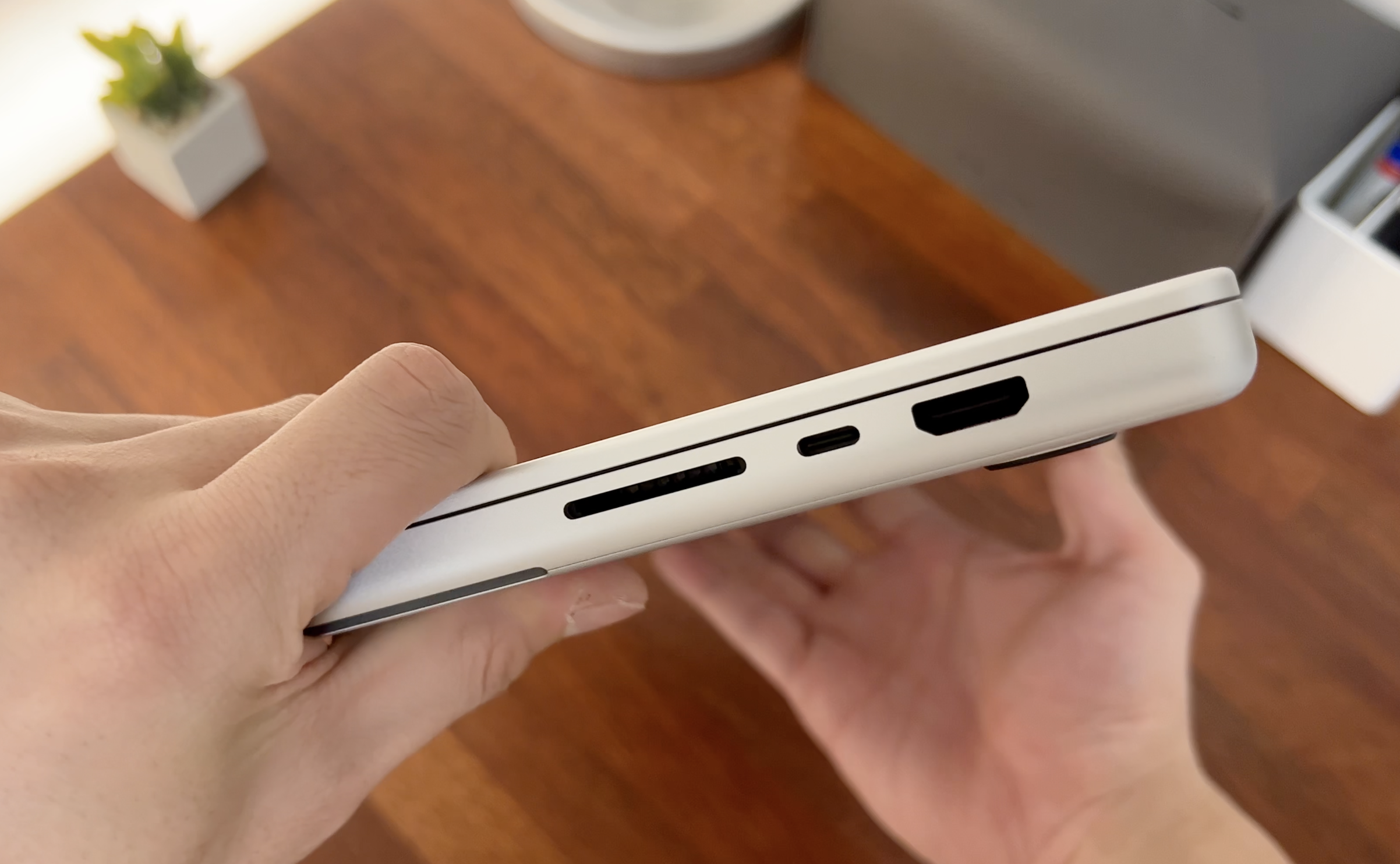 본체 우측에 SD 카드 슬롯, 썬더볼트 포트 1개, hdmi 포트가 있습니다. SD 카드 슬롯은 카드를 넣었을 때 카드 전부가 들어가지 않고 반만 들어가는 형식이며 hdmi 포트는 2.1이 아닌 2.0이 탑재되어있습니다.
