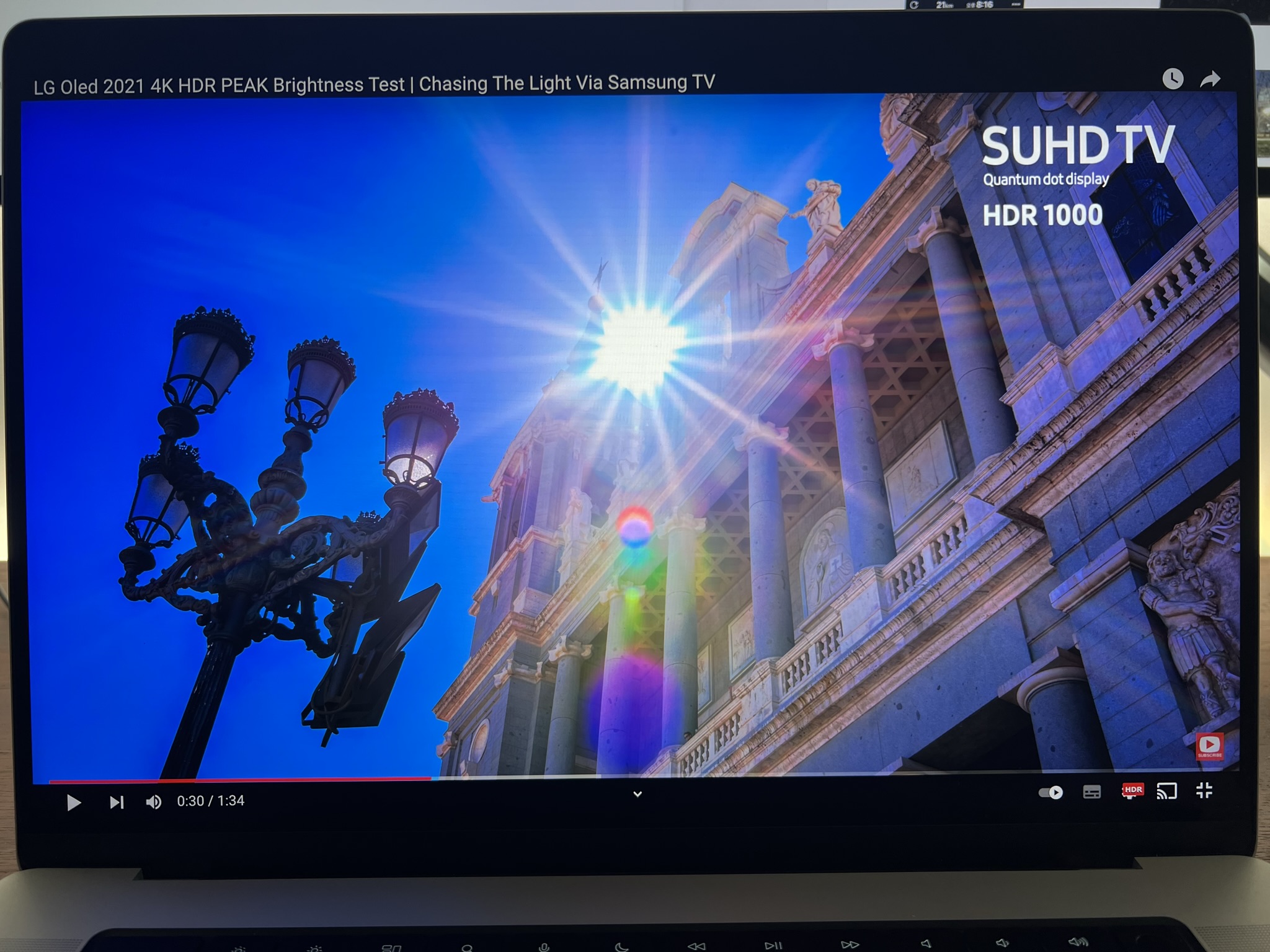 또한 디스플레이가 매우 좋았습니다. 프로모션을 통한 120Hz 디스플레이는 덤입니다. 앱 내 애니메이션 및 마우스 움직임을 매우 부드럽게 표현해 냅니다. 아울러 프로모션은 가변 주사율이기 때문에 배터리 타임에도 큰 손해가 없습니다. 맥북 프로 16인치는 Liquid Retina XDR 디스플레이가 탑재되어 있습니다. 평상시 최대 밝기는 1,000 니트에 달하며 HDR 컨텐츠 시청 시 순간 최대 밝기는 1,600 니트에 달합니다. 참고로 맥북 프로 2021 이전 모델들의 최대 밝기는 500 니트입니다. 또한 미니 LED를 활용하여 화면 내 부분 밝기 조절인 로컬 디밍이 가능하여 밝기 차이를 더욱 극명하게 표현해냅니다.