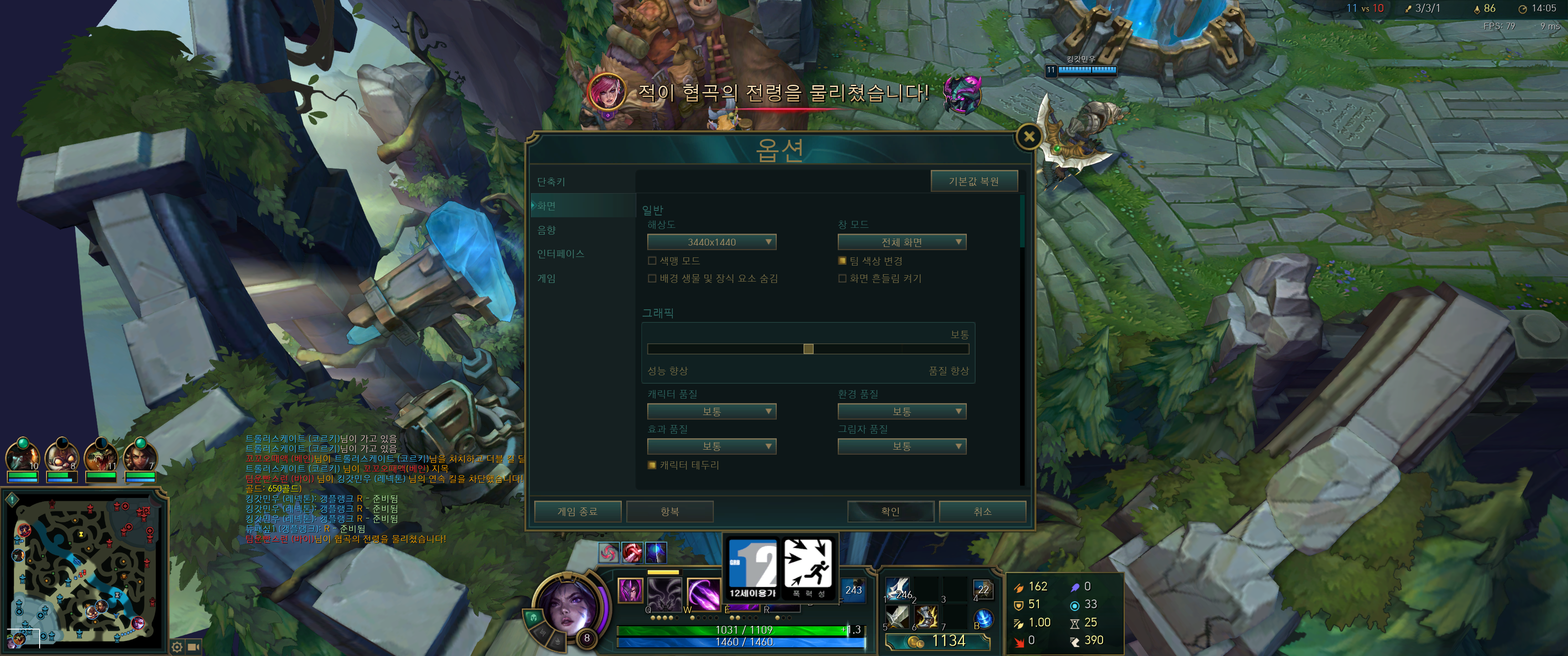 라인전으로 돌아왔습니다. 이제 프레임이 간헐적으로 60대까지 떨어집니다.전투를 하더라도 전반적으로는 70대의 프레임을 유지합니다. 급격한 프레임 드롭이 없기 때문에 플레이에는 문제가 없습니다.