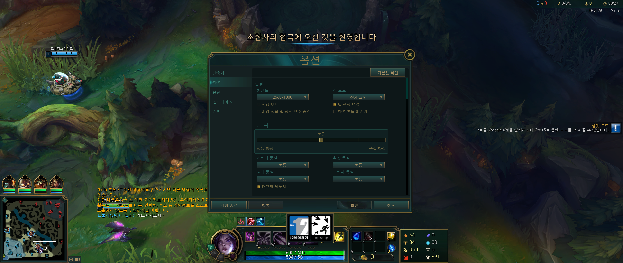 라인전 단계에서는 80~90 정도의 프레임을 보여줍니다. 1080p 해상도, 보통 옵션은 플레이에 전혀 문제가 없었습니다.