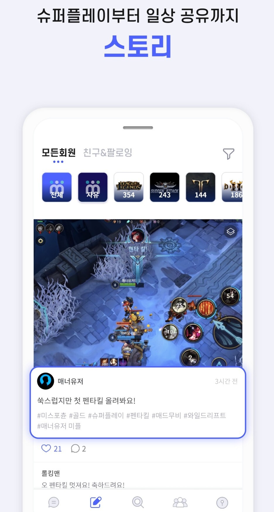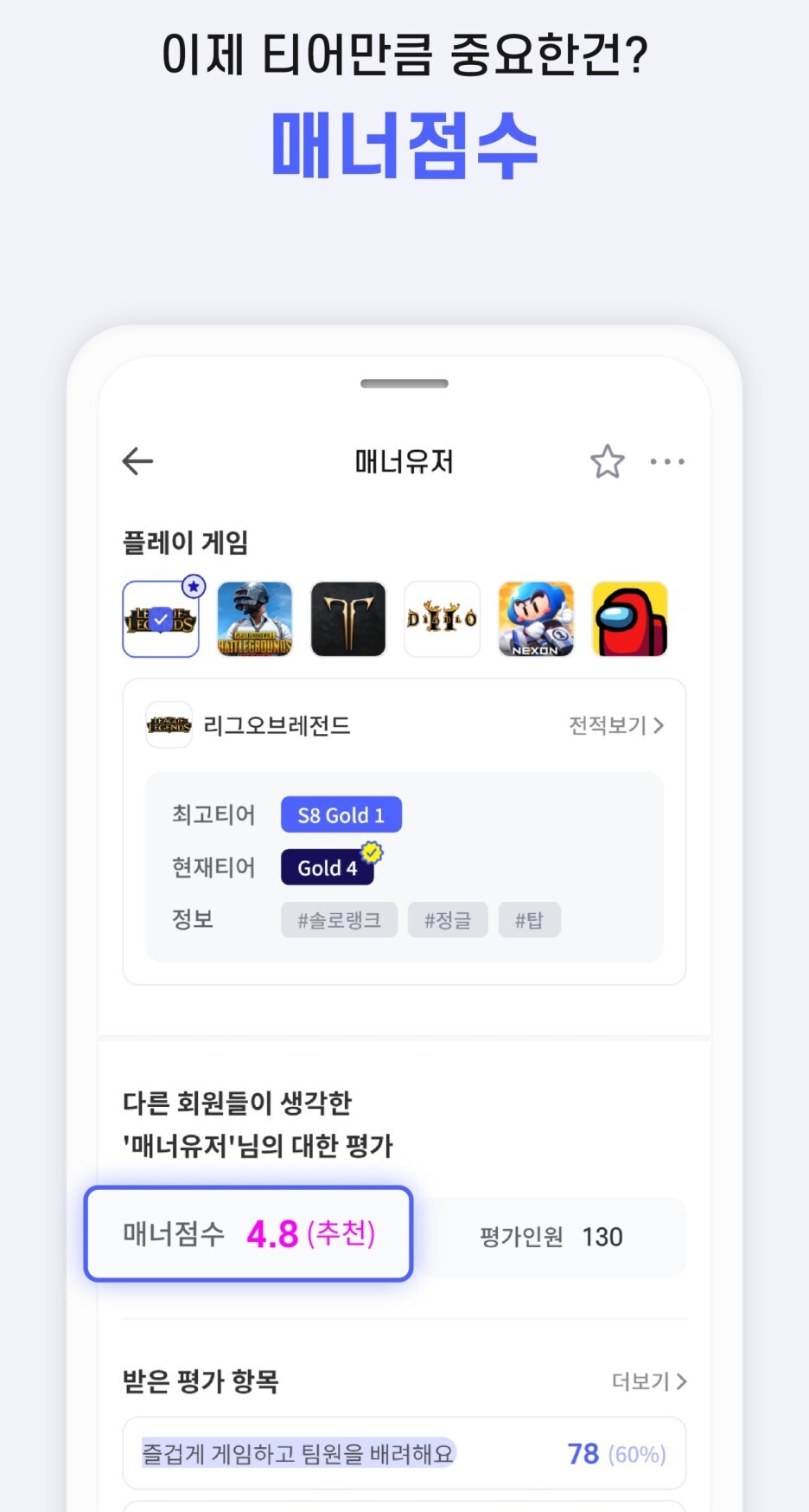 매너유저의 소셜라이징 플랫폼. 매너 좋은 게임친구와 함께 게임하고 이야기를 나누어보세요!