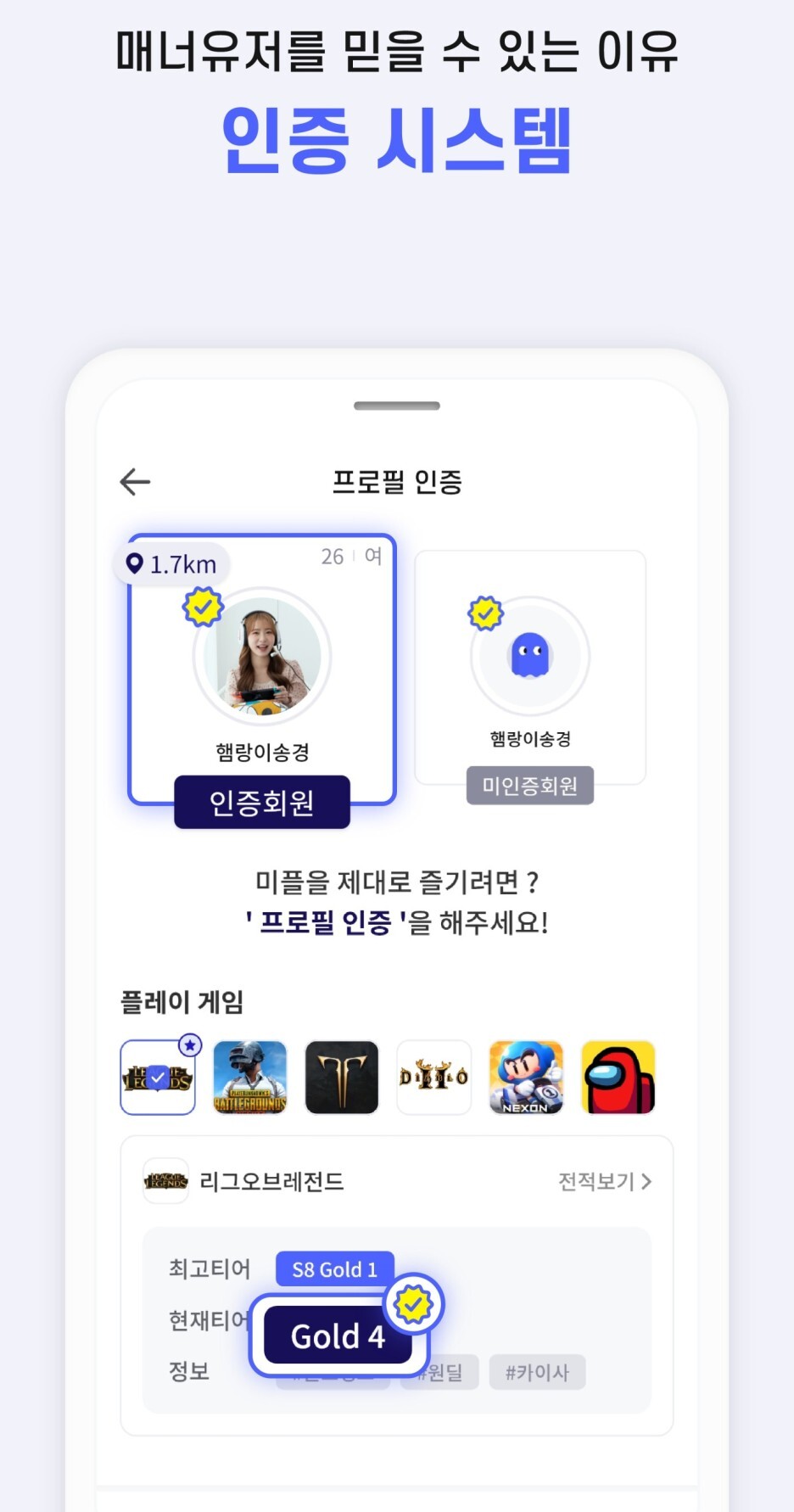 아무리 게임친구찾기 기능과 프로필이 잘 구성되어 있더라도 그게 진짜가 아니라면 아무 소용 없겠죠? 미플의 인증 시스템은 기존의 게임친구찾기를 위해 사용되는 플랫폼에서 가장 큰 문제였던 신뢰도 문제를 해결할 수 있어요!