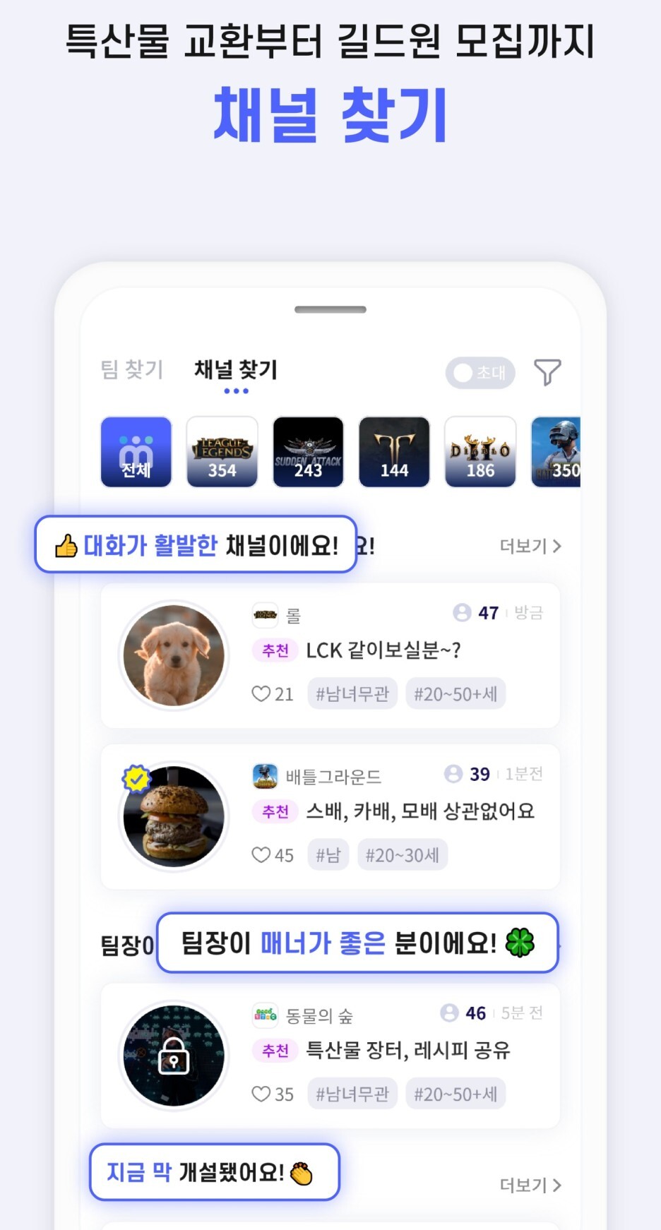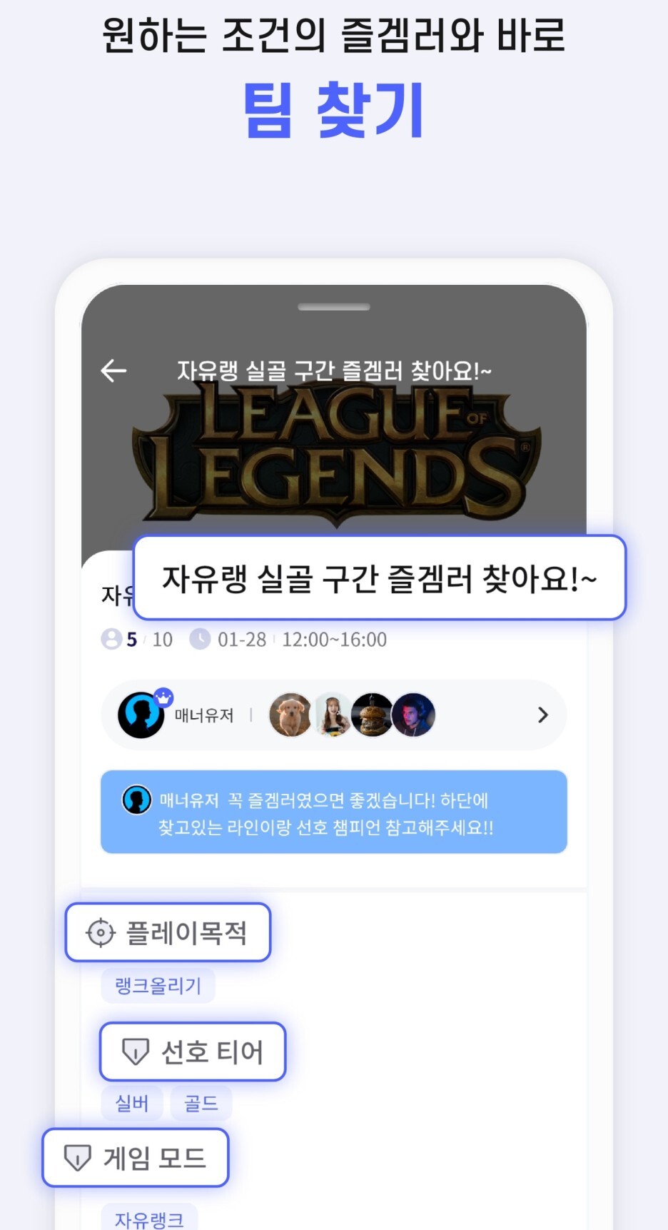 '팀 찾기'는 가장 빠르게 게임친구를 찾을 수 있는 서비스입니다. 자기가 원하는 조건을 입력하면 다른 게이머들도 그 조건을 보고 들어올 수 있죠. 조건은 매우 상세하게 정할 수 있어요. 예를 들면 "나는 실~골 구간의 서포터 중에서도 레오나, 블리츠크랭크, 쓰레쉬를 원하고 팀의 목적은 랭크 올리기다." 정도예요. 그리고 이런 조건은 롤뿐만 아니라 동물의 숲, 오버워치, 배틀그라운드 등 500여 가지의 게임에서 다 설정할 수 있습니다!