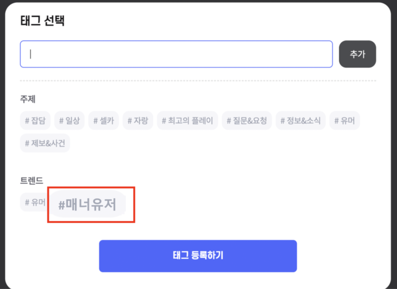 스토리를 작성하는 방법은 간단합니다. 우선 스토리탭에 들어가서 '스토리 만들기'를 선택합니다. 그 다음 원하는 내용, 주제 게임, 이미지를 등록합니다. 그 다음 태그를 선택하면 태그선택화면이 나옵니다. 하단 '트렌트' 태그 중에서 '#매너유저' 태그를 삽입하고 스토리를 등록하면 끝!