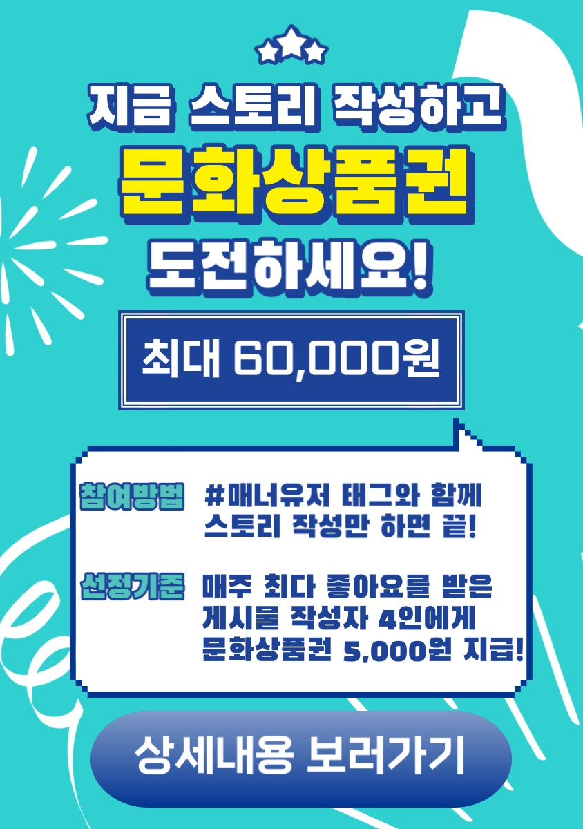 - 한 명에 한 주에 최다 좋아요를 받은 스토리를 2개 올렸다고 해서 문화상품권 만원을 받을 순 없습니다.