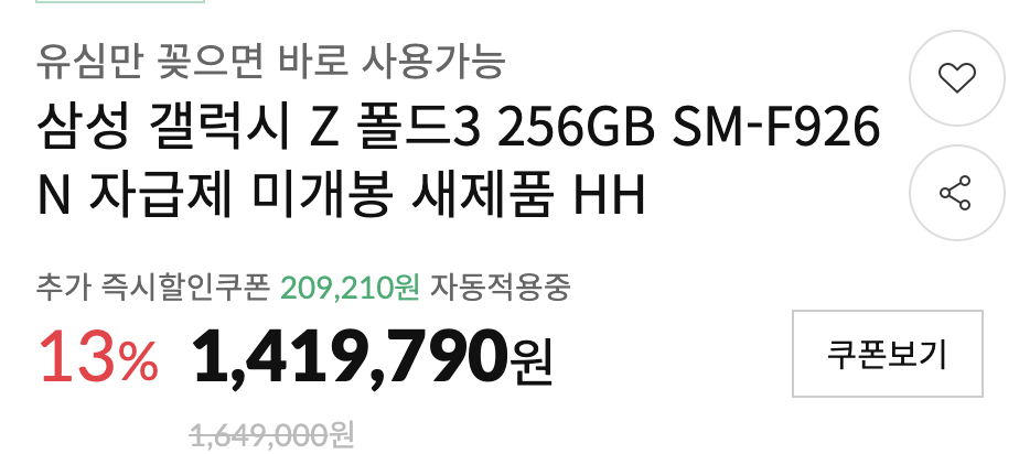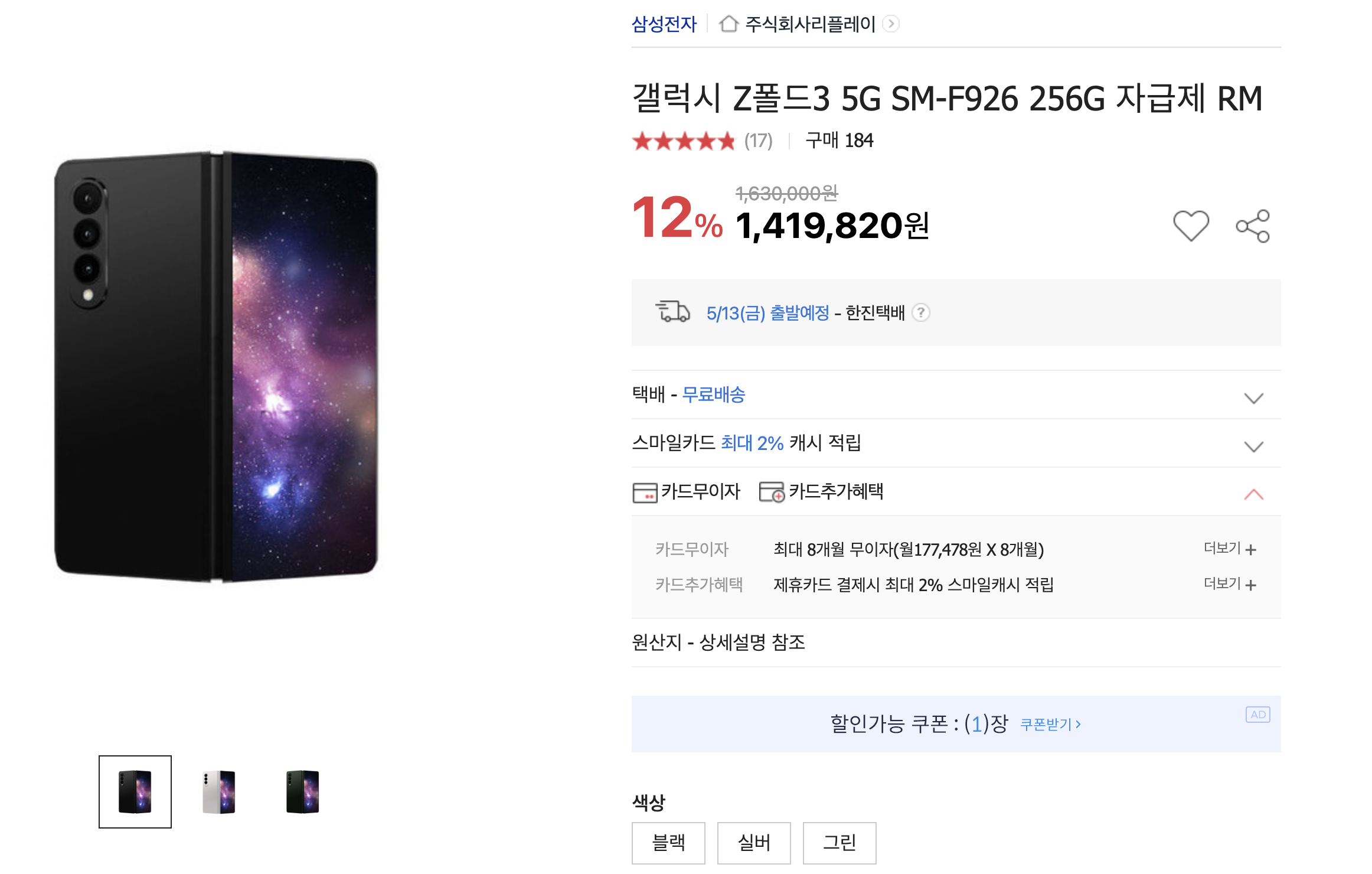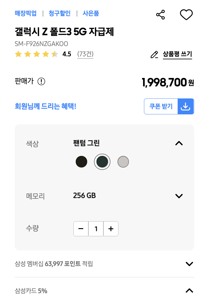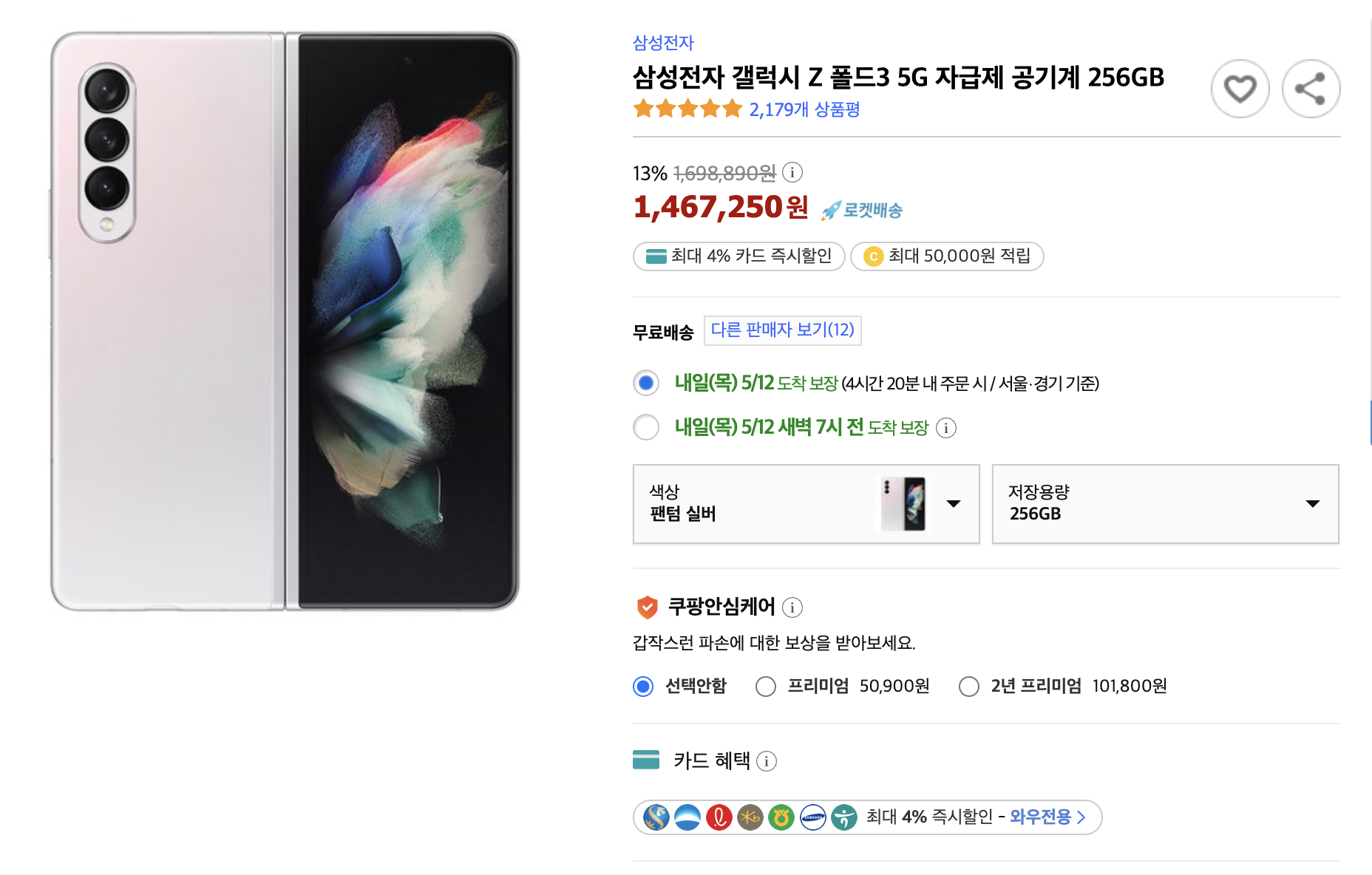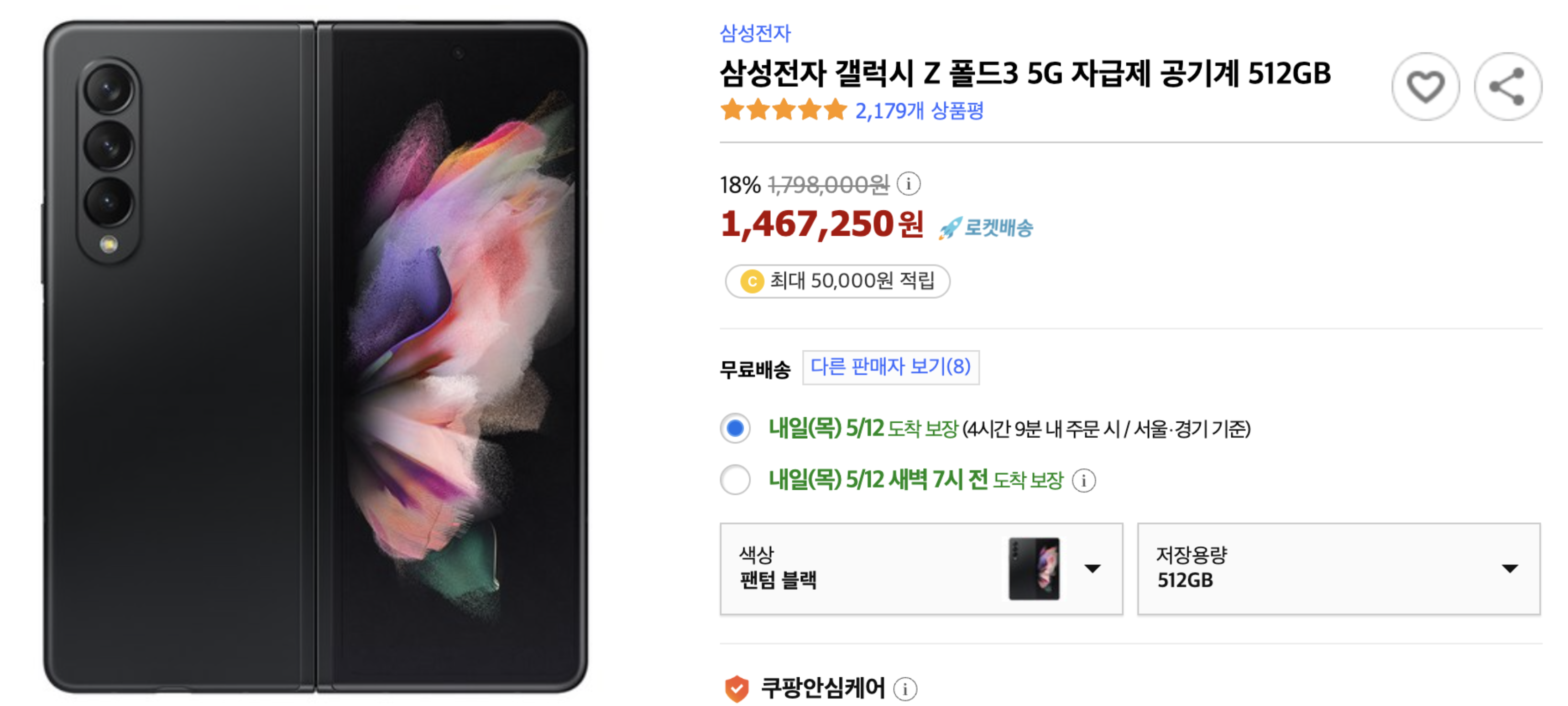 사실상 쿠팡에서 512GB 모델을 사는 것이 가장 가성비가 좋다는 이야기입니다. 이미 자급제를 알아보고 계신 독자분이 시라면 '가성비'에 민감할 것입니다. 스마트폰, 특히 시장에 나와있는 모든 브랜드의 모든 모델 중 가장 하이엔드 스마트폰인 폴드 시리즈를 구매하신다면 근시일 내에 기기를 변경할 가능성은 극히 적어 보입니다. 꼭 256GB 최저가에 62,000원을 추가하여 512GB 모델을 구매하기 바랍니다.